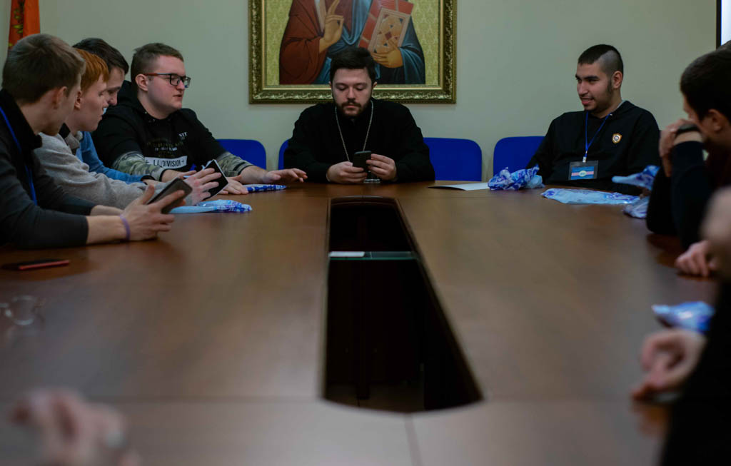 Третьим этапом стала беседа участников съезда с руководителем молодежного отдела епархии священником Димитрием Прохоровым, помощником руководителя – Прохоровой Алисой Эдуардовной, сотрудниками отдела и представителями молодежного актива.