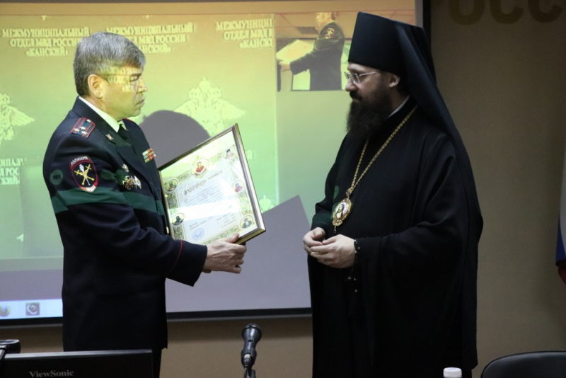 Обращаясь к собравшимся, Владыка поблагодарил сотрудников Отдела за большой вклад в строительство храма в честь святого равноапостольного великого князя Владимира, построенного в память о полицейских, погибших при исполнении служебных обязанностей и вручил Архиерейскую грамоту от Митрополита Красноярского и Ачинского Пантелеймона члену Красноярской региональной Чувашской национально-культурной автономии начальнику Отдела МВД России по г. Норильску Геннадию Маслову за активную помощь в восстановлении и строительстве храмов в г. Норильске. Епископ Агафангел также поблагодарил председателя Общественного совета при Отделе МВД России по г. Норильску и вручил Архиерейскую грамоту Юрию Кононченко за бескорыстный труд во славу Божию по строительству храма в честь святого равноапостольного великого князя Владимира в г. Норильске.