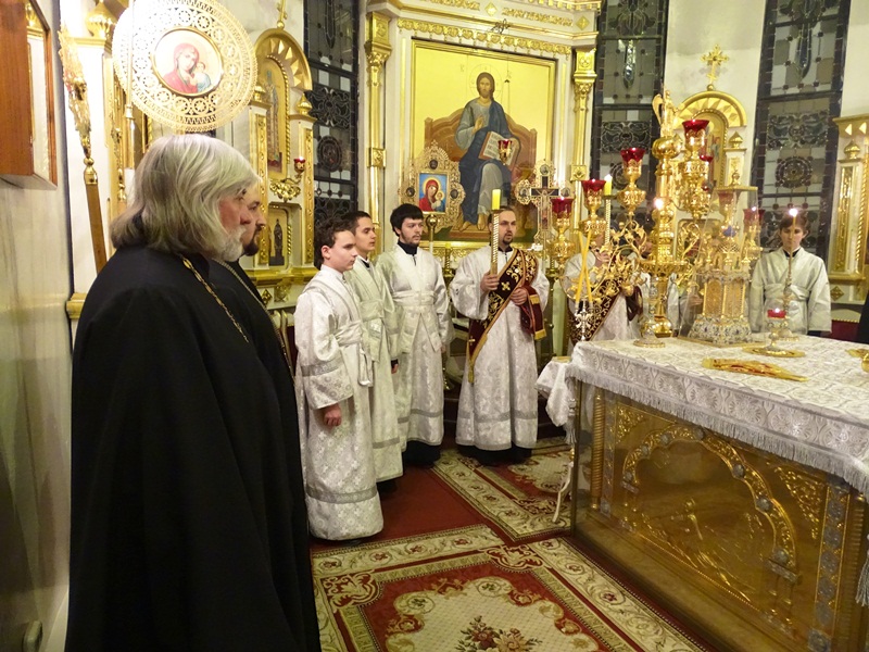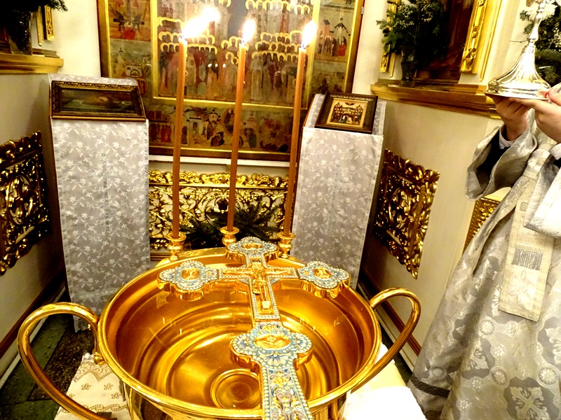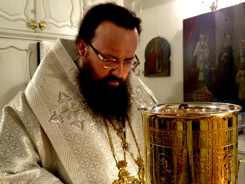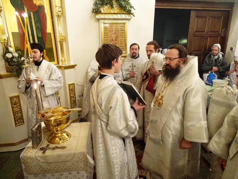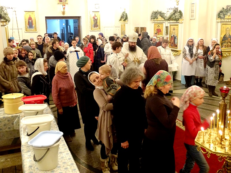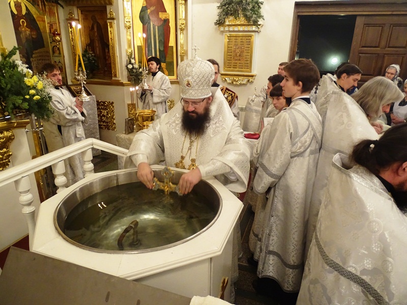 По окончании Великой вечерни епископ Агафангел в сослужении духовенства совершил Великое освящение воды и окропил прихожан святой водой.