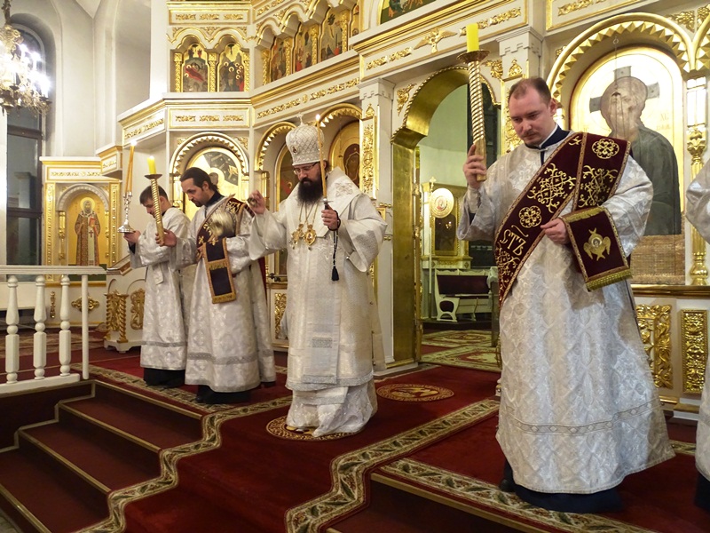 Его Преосвященству сослужили: иеромонах Герман (Мельников), исполняющий обязанности секретаря епархии; протоиерей Владимир Иванов, благочинный Норильского округа; иерей Роман Трофимов, штатный священник храма святителя Николая чудотворца поселка Диксон; клирики кафедрального собора.
