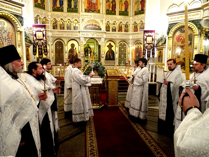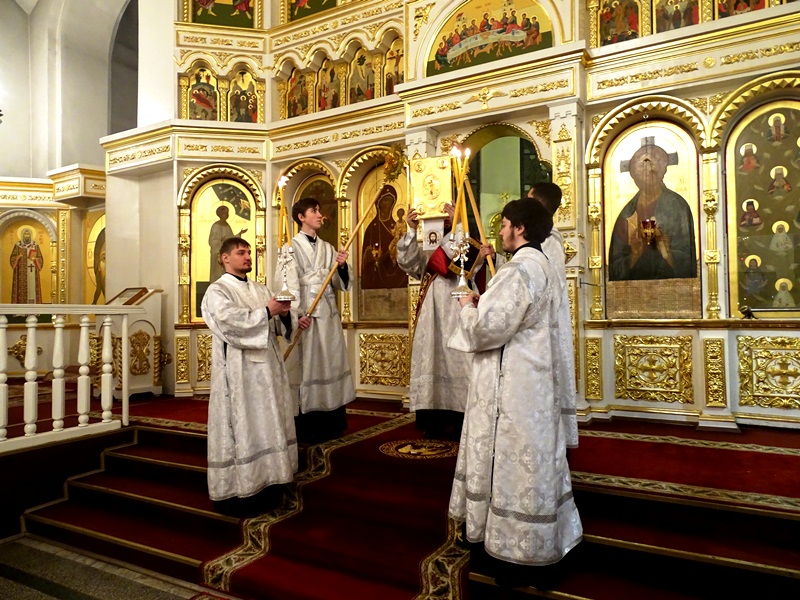 По окончании Богослужения духовенство во главе с Архипастырем совершили положенное славление перед зажженной свечей.