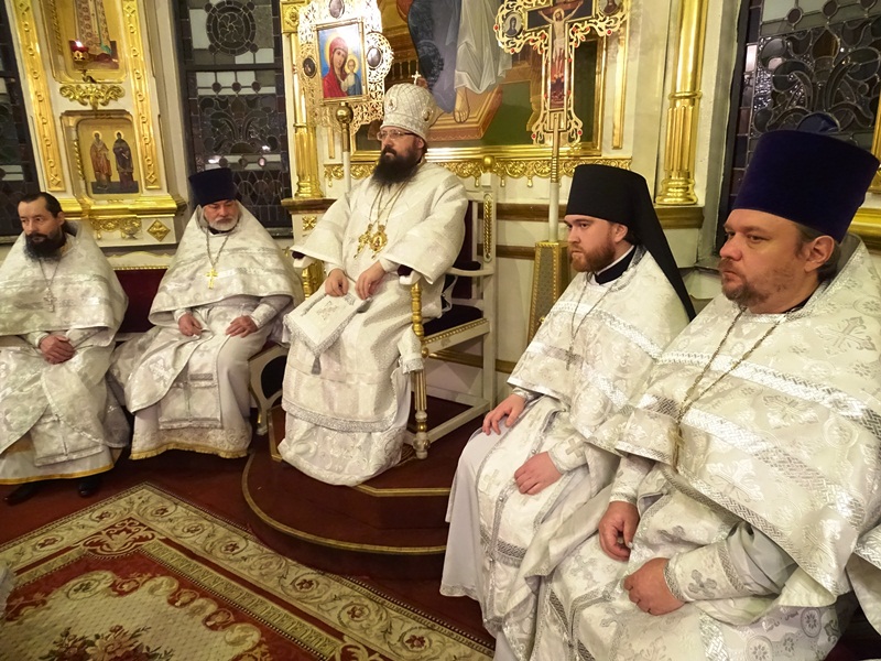Его Преосвященству сослужили: иеромонах Герман (Мельников) — исполняющий обязанности секретаря Норильской епархии; протоиерей Владимир Иванов – благочинный Норильского округа и ключарь Кафедрального собора; протоиерей Димитрий Харцыз – председатель епархиального отдела по вопросам взаимодействия с Вооруженными Силами; иерей Сергий Андреев — председатель епархиального отдела социальной деятельности и церковной благотворительности; диакон Алексий Трофимов – председатель епархиального отдела по взаимодействию с молодежью; штатные клирики кафедрального собора.
