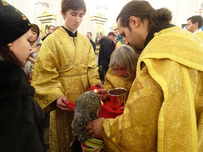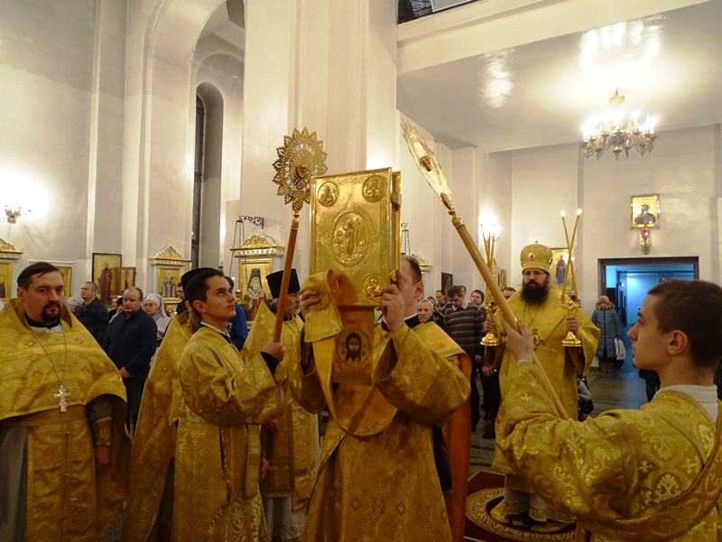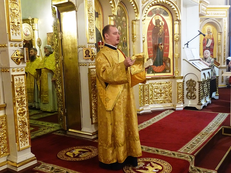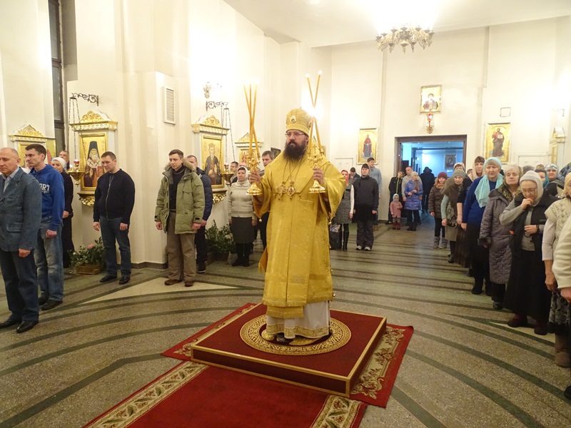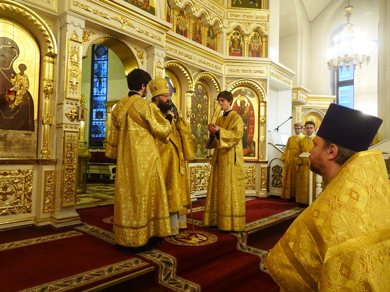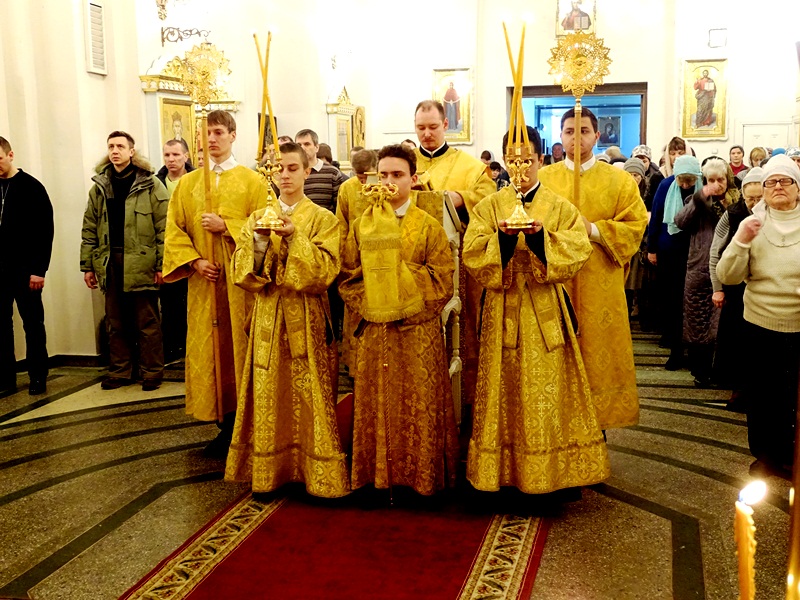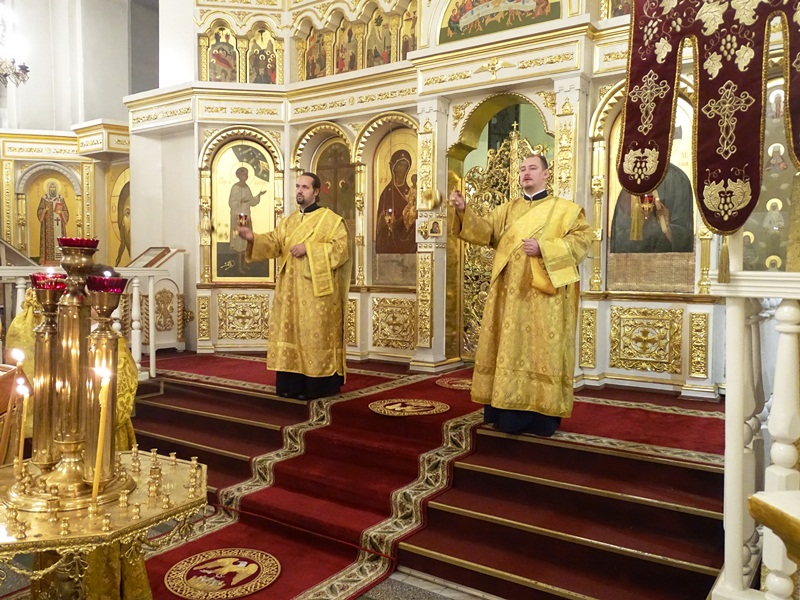 Его Преосвященству сослужили: благочинный Норильского округа и ключарь кафедрального собора протоиерей Владимир Иванов, председатель епархиального отдела по взаимодействию с вооруженными силами протоиерей Димитрий Харцыз, клирики кафедрального собора.