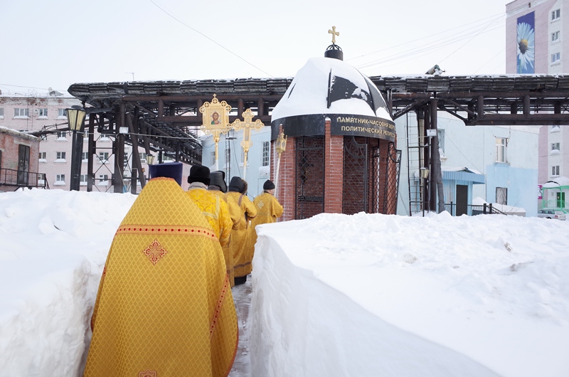 8 февраля 2015 года в Неделю о блудном сыне, в день памяти Новомучеников и Исповедников Российских, по Благословению Его Преосвященства, Преосвященнейшего Агафангела Епископа Норильского и Туруханского, в Введенском храме города Дудинки по окончании Божественной Литургии был совершён молебен Новомученикам Российским и Крестный Ход к часовне-памятнику в честь Животворящего Креста Господня расположенном с восточной стороны храма.