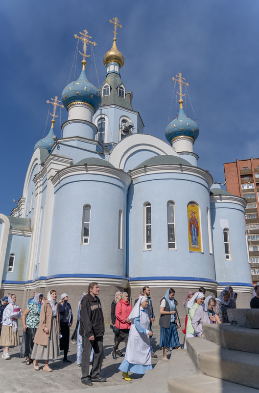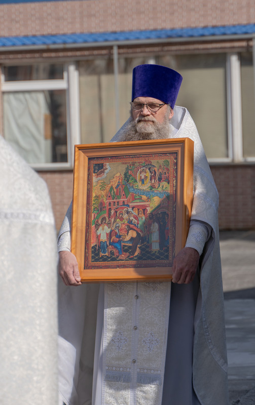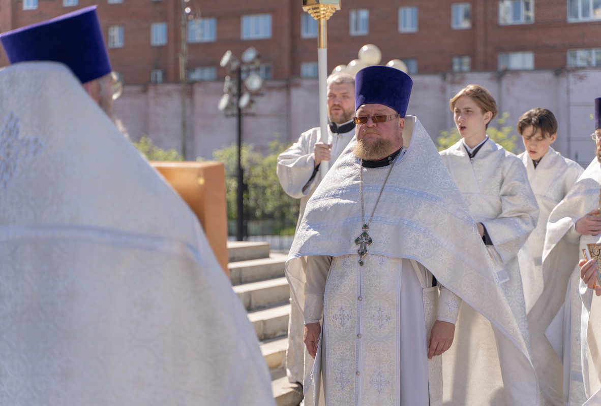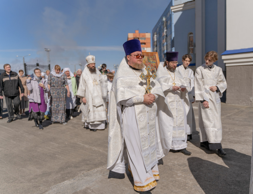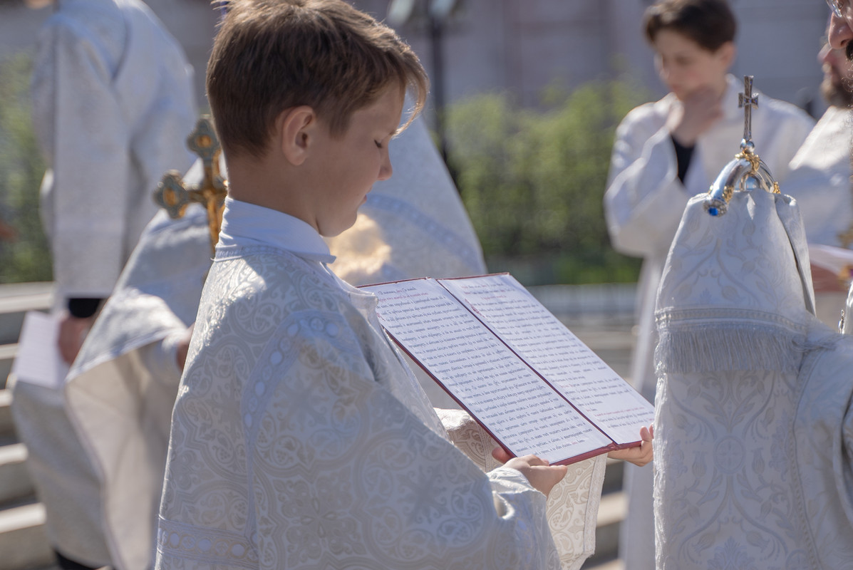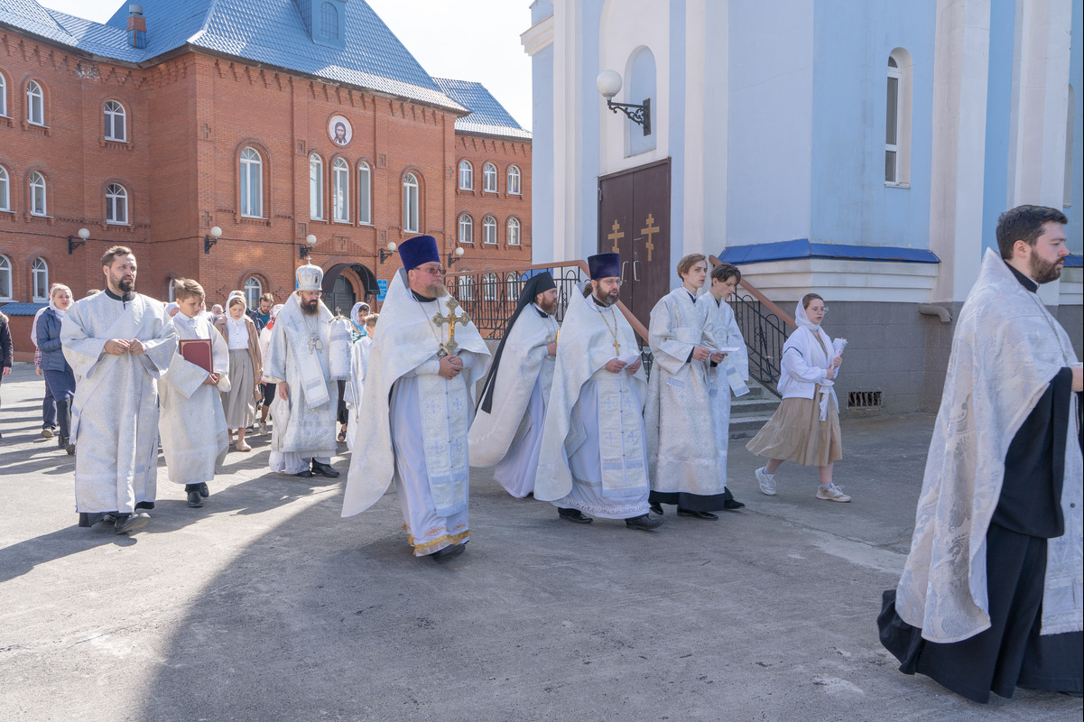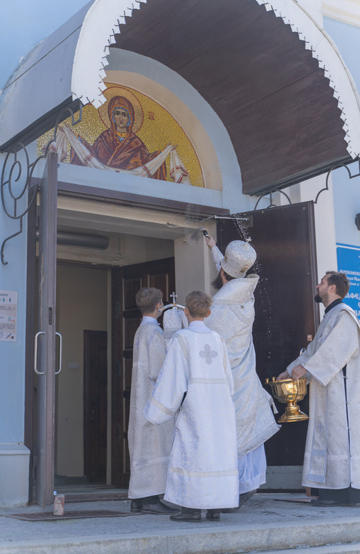 После Божественной литургии Архипастырь в сослужении духовенства совершил крестный ход в честь престольного праздника и освятил новую мозаичную икону, установленную над центральным входом в кафедральный собор в честь иконы Божией Матери «Всех скорбящих Радость»