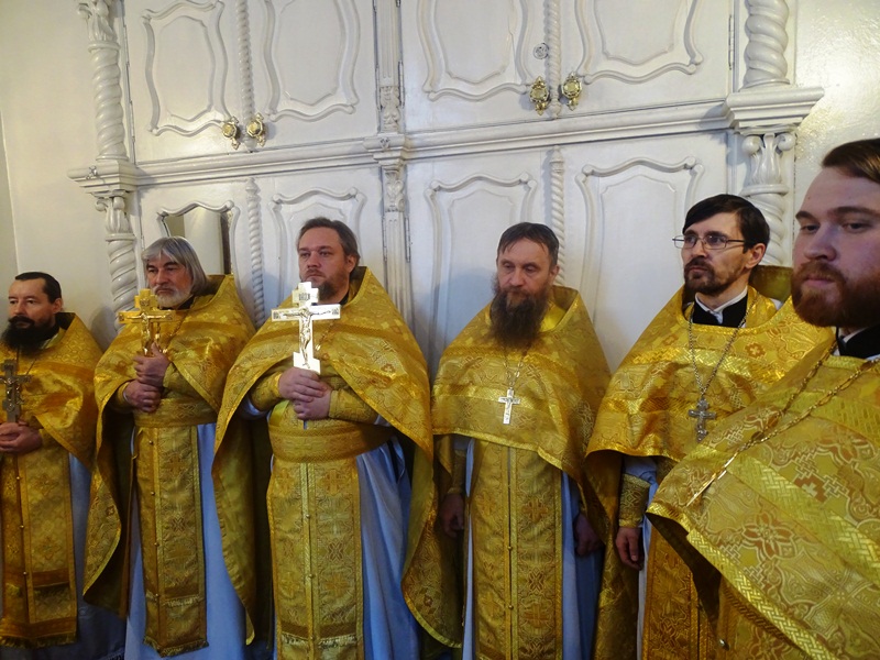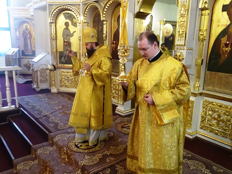 Его Преосвященству сослужили: исполняющий обязанности секретаря Норильской епархии иеромонах Герман (Мельников); благочинный Норильского округа протоирей Владимир Иванов; председатель отдела по взаимодействию с ВС РФ протоиерей Димитрий Харцыз; штатный клир собора.