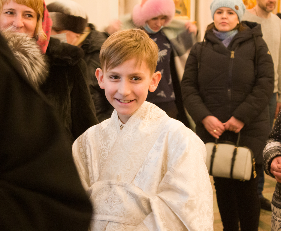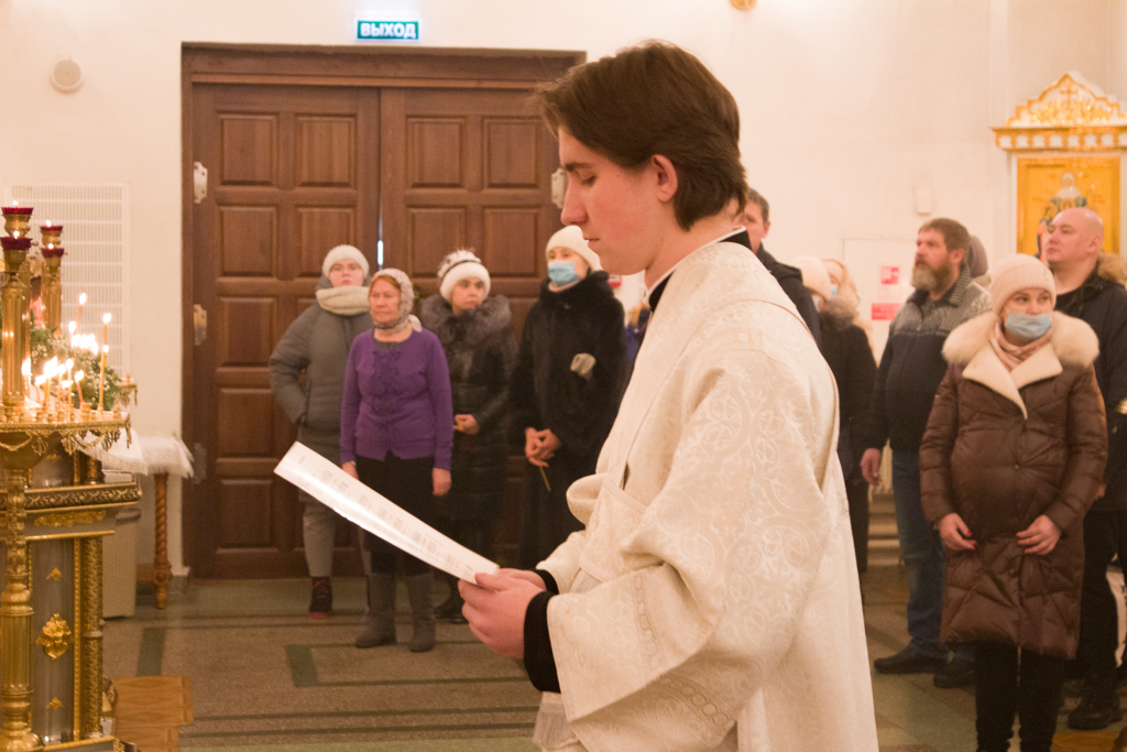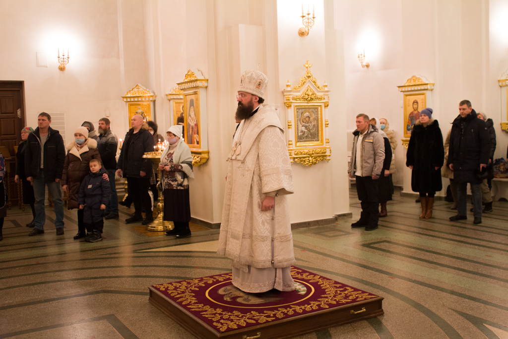 Его Преосвященству сослужили: секретарь Норильской епархии иеромонах Герман (Мельников); заведующий канцелярией Норильского епархиального управления иерей Димитрий Прохоров; соборное духовенство.