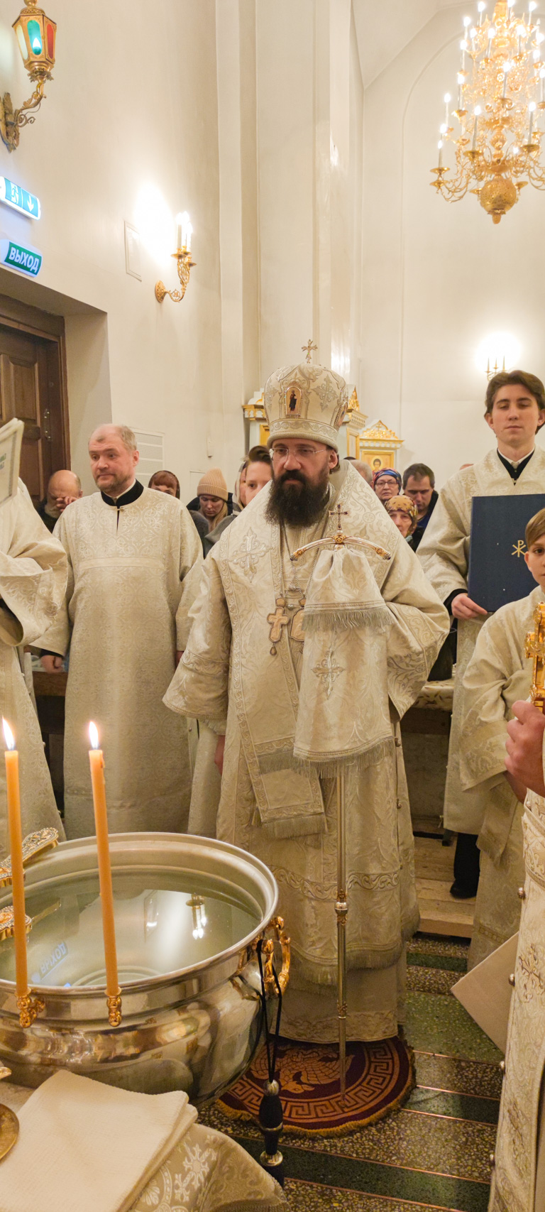 В ночь с 18 на 19 января 2022 года, в праздник Крещения Господа, Бога и Спаса нашего Иисуса Христа, Управляющий Норильской епархией Преосвященнейший Агафангел, епископ Норильский и Туруханский, совершил Божественную литургию, а накануне – Всенощное бдение, в кафедральном соборе в честь иконы Божией Матери «Всех скорбящих Радость» города Норильска.
