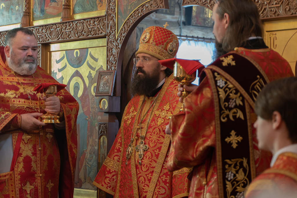 За Литургией Его Преосвященству сослужили: секретарь Норильской епархии, настоятель кафедрального собора иконы Божией Матери "Всех скорбящих Радость" г. Норильска иеромонах Герман (Мельников); благочинный Норильского округа, настоятель храма новомучеников и исповедников Церкви Русской г. Норильска иерей Геннадий Дубинко; настоятель храма Живоначальной Троицы района Талнах г. Норильска протоиерей Даниил Тихонов; клирик храма Живоначальной Троицы р-на Талнах г. Норильска иерей Сергий Кузьменко.