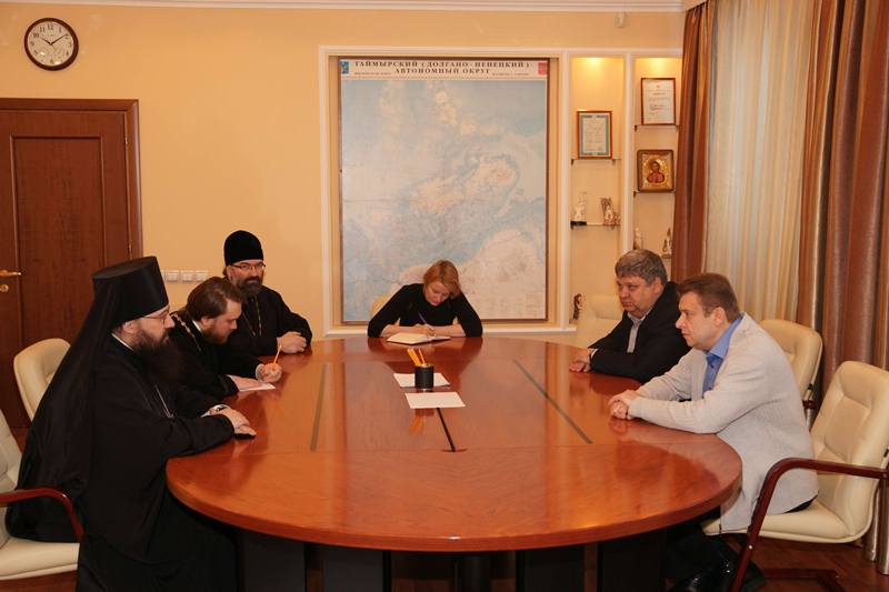 Его Преосвященство сопровождали секретарь Норильской епархии, иеромонах Герман (Мельников) и Благочинный Таймырского округа, настоятель Свято-Введенского храма города Дудинки протоиерей Георгий Ицков. На встрече также присутствовал заместитель Руководителя Администрации города Дудинки – председатель Комитета по обеспечению деятельности органов местного самоуправления Алексей Петрович Фомин.