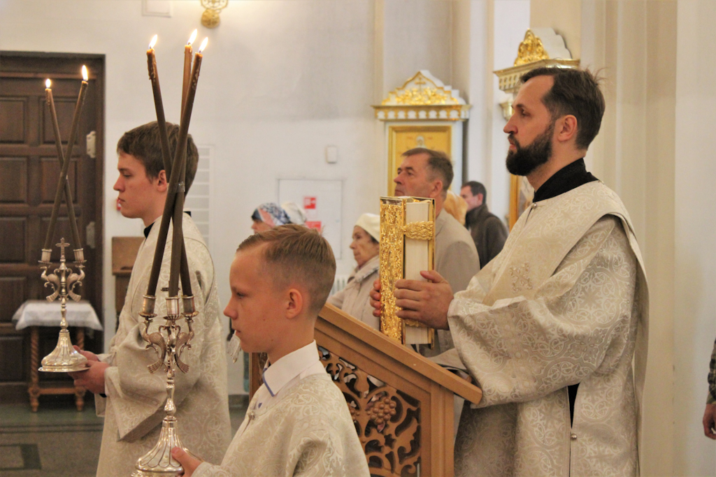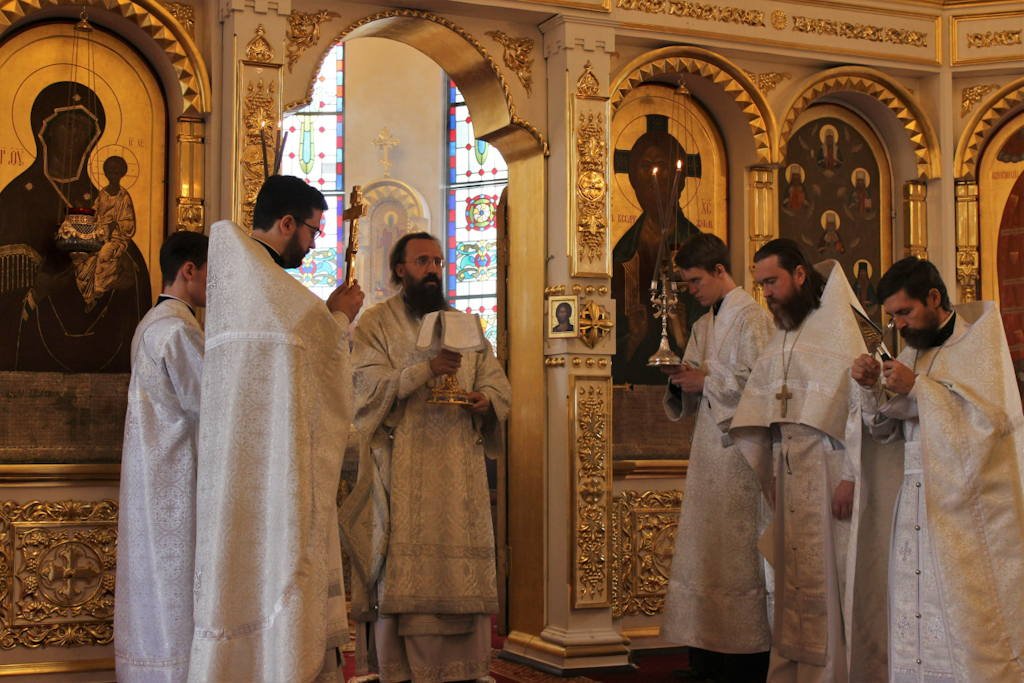 За Литургией Его Преосвященству сослужили: секретарь Норильской епархии, настоятель кафедрального собора иконы Божией Матери «Всех скорбящих Радость» г. Норильска иеромонах Герман (Мельников); заведующий канцелярией Норильского епархиального управления, благочинный кафедрального собора иерей Димитрий Прохоров; клирик кафедрального собора иерей Сергий Андреев.