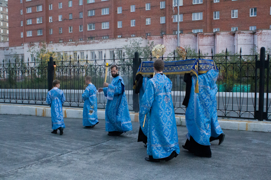 После великого славословия был совершён крестный ход с плащаницей с изображением Успения Пресвятой Богородицы.