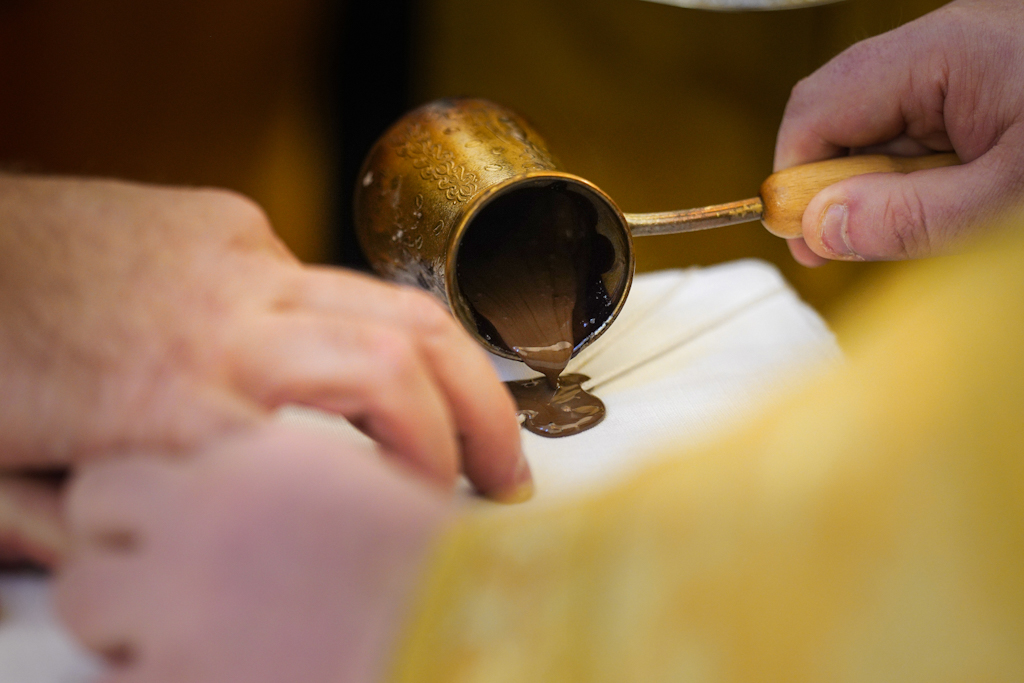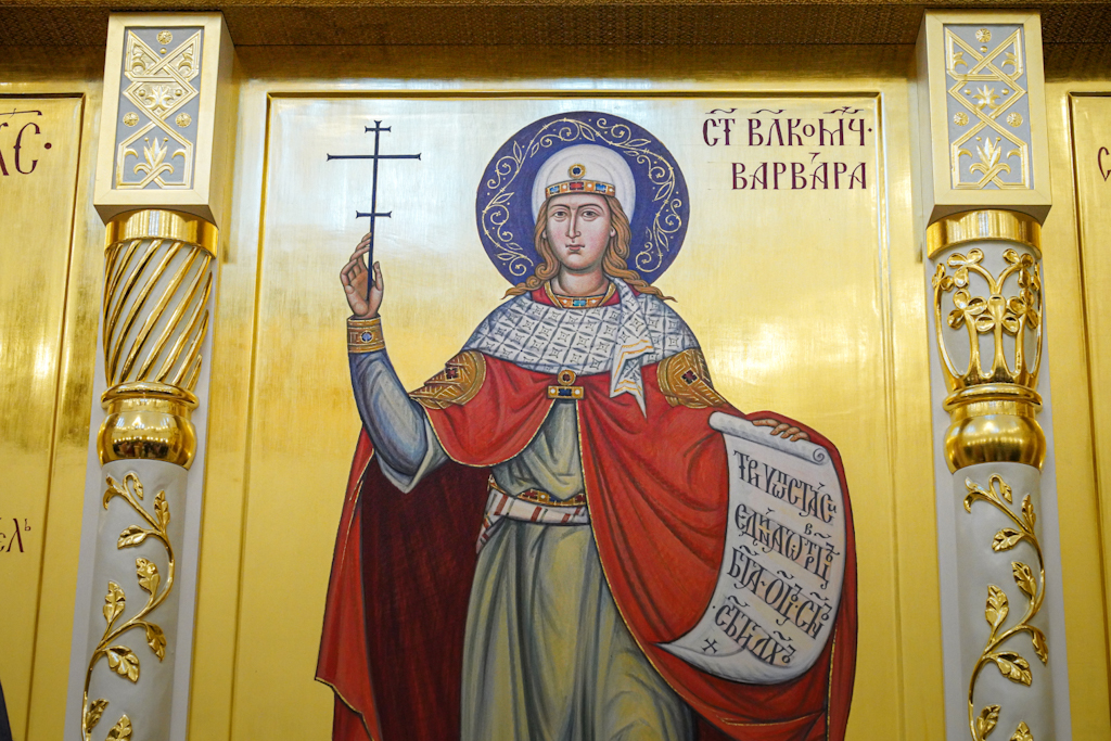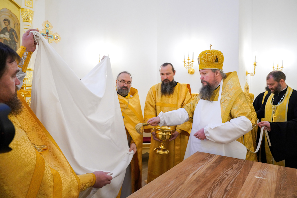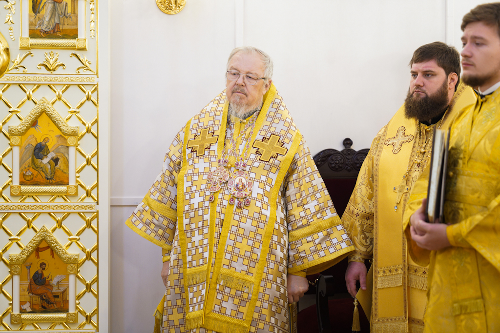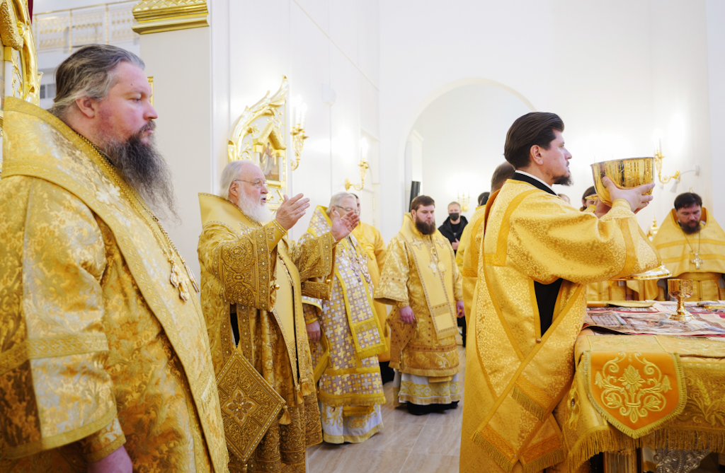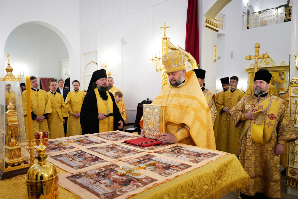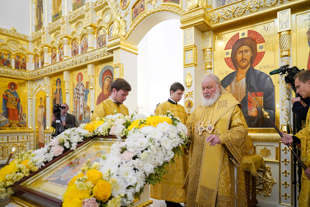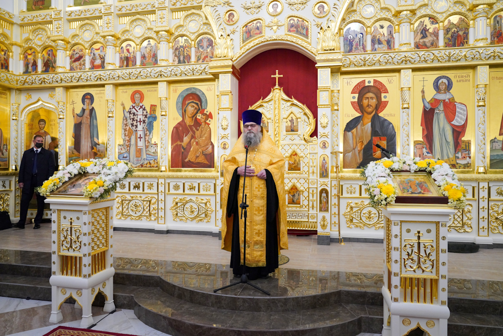По окончании Литургии епископ Норильский и Туруханский Агафангел приветствовал Святейшего Патриарха и преподнес Его Святейшеству образ великомученицы Варвары.