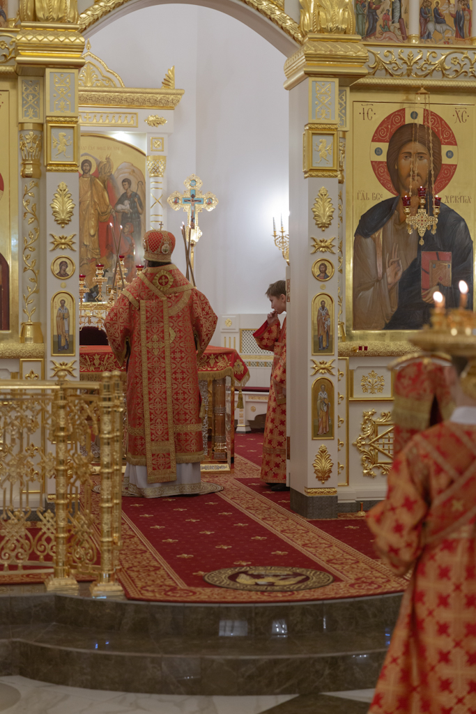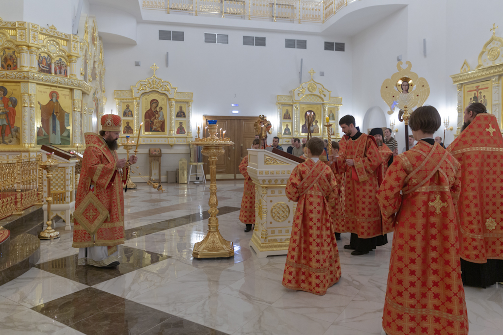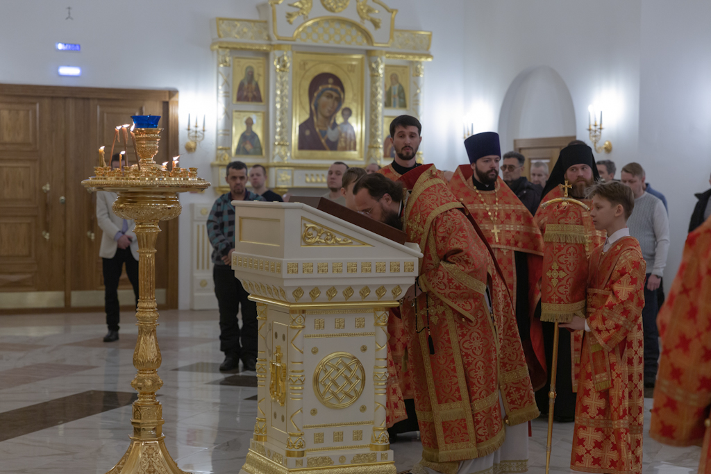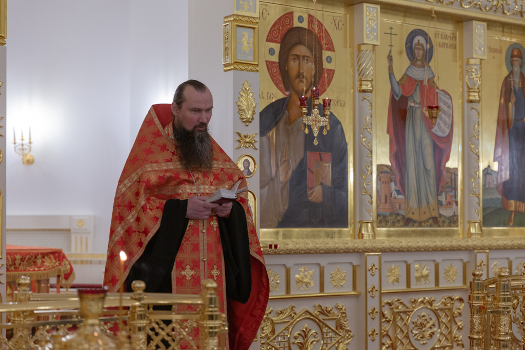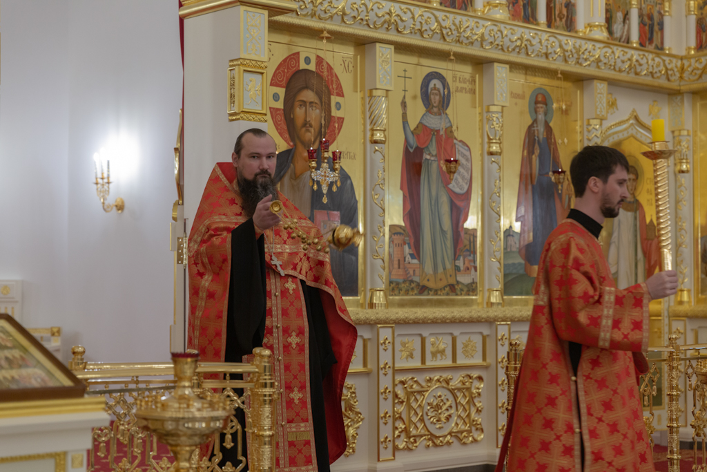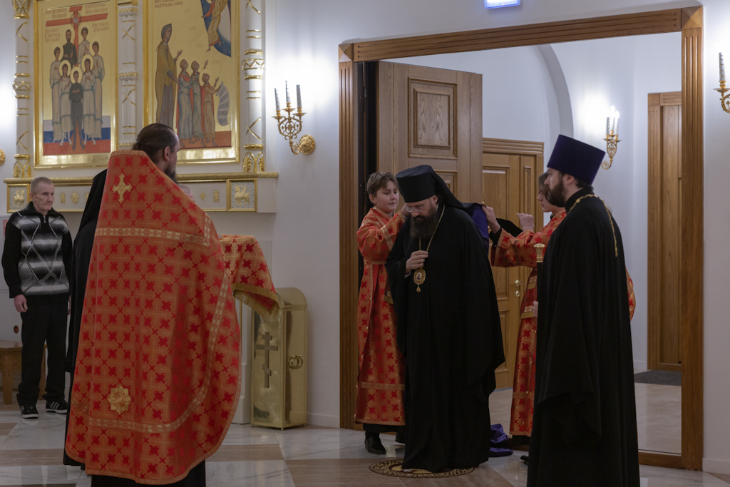 Его Преосвященству сослужили: секретарь Норильской епархии, настоятель храма великомученицы Варвары района Талнах города Норильска иеромонах Герман (Мельников); заведующий канцелярией Норильского епархиального управления, благочинный кафедрального собора иконы Божией Матери «Всех скорбящих Радость» города Норильска иерей Димитрий Прохоров; руководитель епархиального отдела по взаимодействию с казачеством, клирик храма Святой Троицы района Талнах города Норильска иерей Сергий Кузьменко; заместитель руководителя епархиального отдела религиозного образования и катехизации, клирик храма великомученицы Варвары иерей Антоний Проняев.