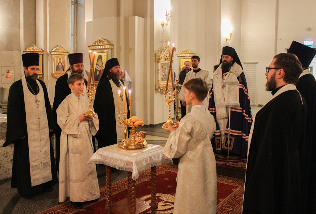 За Литургией Его Преосвященству сослужили: секретарь Норильской епархии, настоятель кафедрального собора иконы Божией Матери «Всех скорбящих Радость» города Норильска иеромонах Герман (Мельников); духовник Норильской епархии протоиерей Владимир Иванов; руководитель епархиального отдела по социальному служению и церковной благотворительности иерей Алексий Пирогов; заведующий канцелярией Норильского епархиального управления, благочинный кафедрального собора города Норильска иерей Димитрий Прохоров.