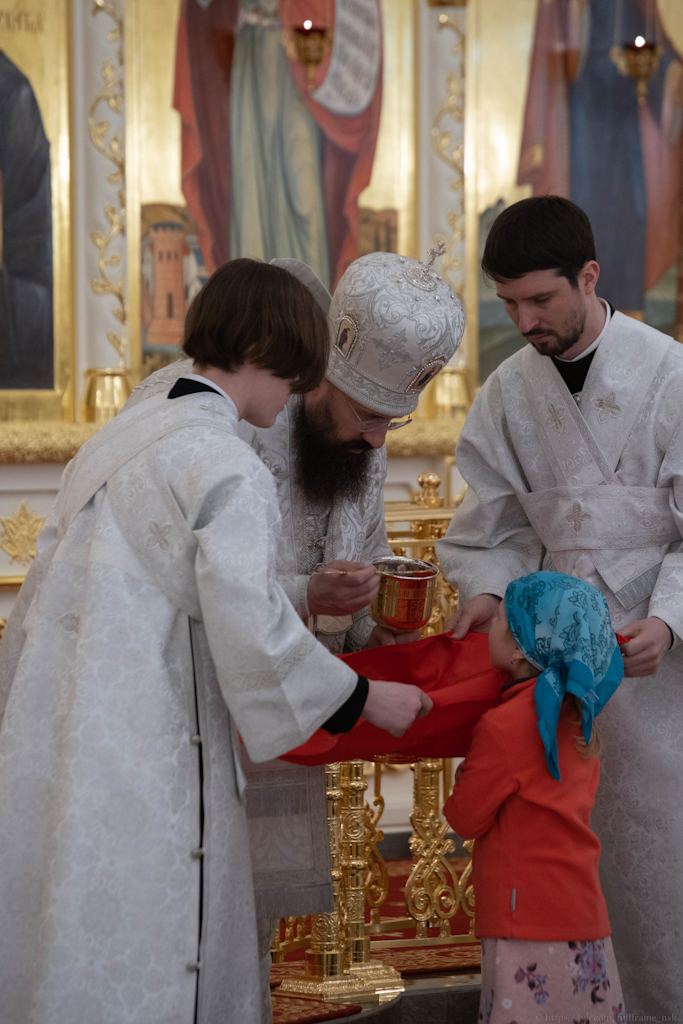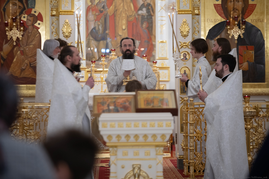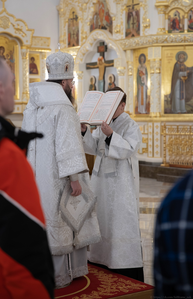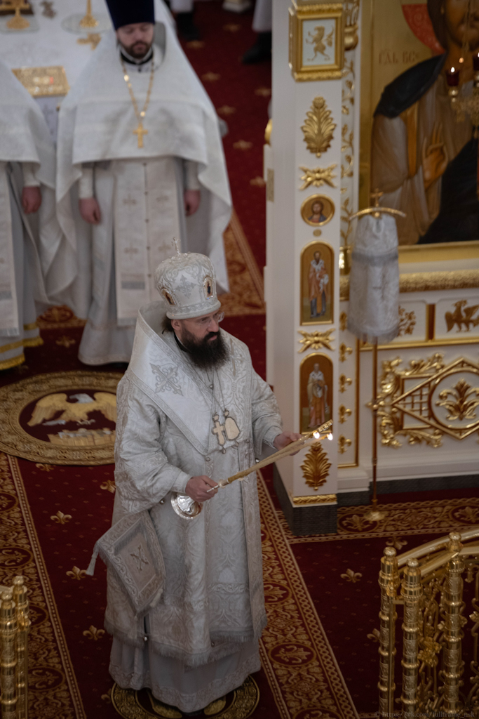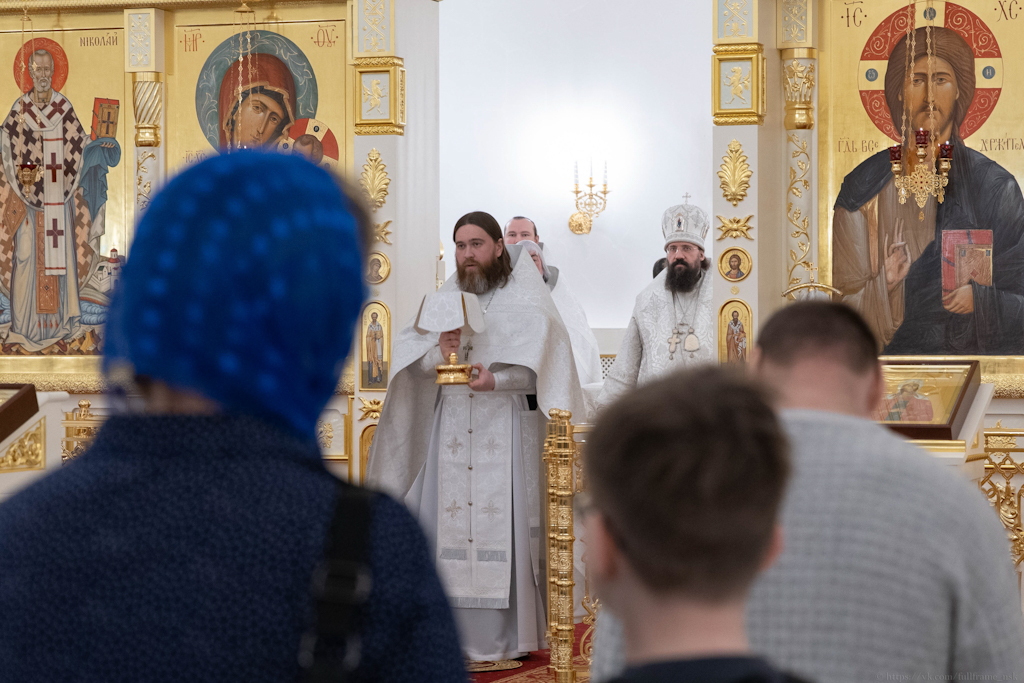 За Литургией Его Преосвященству сослужили: секретарь Норильской епархии, настоятель храма великомученицы Варвары района Талнах города Норильска иеромонах Герман (Мельников); духовник Норильской епархии протоиерей Владимир Иванов; заведующий канцелярией Норильского епархиального управления, благочинный кафедрального собора города Норильска иерей Димитрий Прохоров; заместитель руководителя епархиального отдела религиозного образования и катехизации, клирик храма великомученицы Варвары района Талнах города Норильска иерей Антоний Проняев.