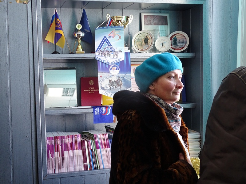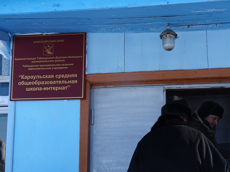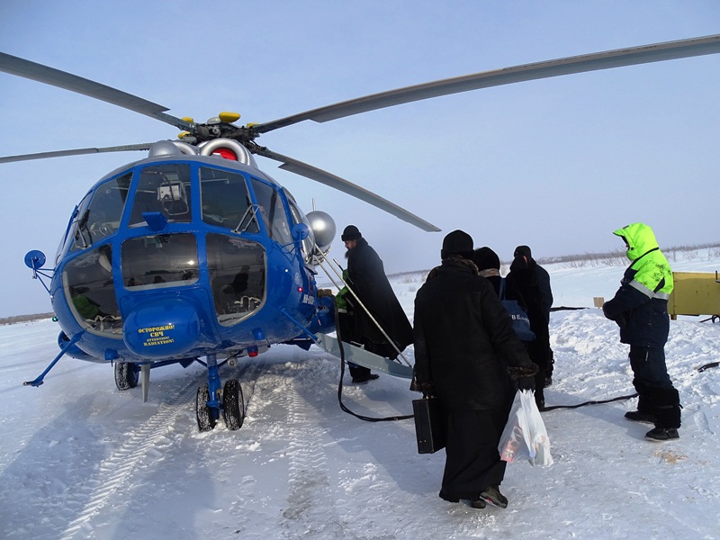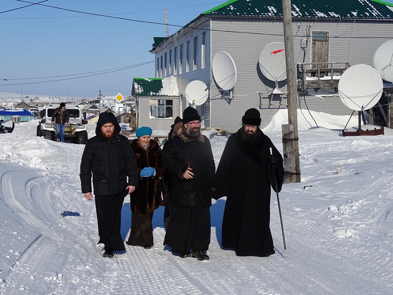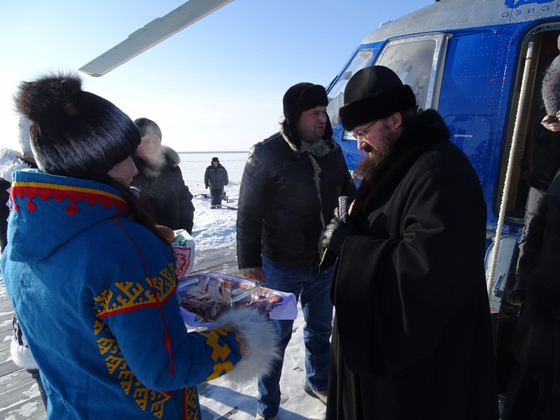На вертолетной площадке гостей встретил глава муниципального образования «Сельское поселение Караул» Дмитрий Владимирович Рудник. Девочки в национальной одежде встретили Владыку не только русским караваем, но и подносом со свежеструганной рабой – хлебом Таймыра. Затем все в специальных вездеходах поехали к зданию администрации, где состоялась рабочая встреча, посвященное главному делу, ради которого приехала столь представительная делегация.