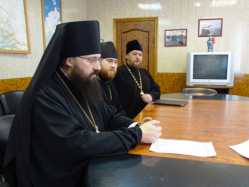 Преосвященнейшего Владыку сопровождали: секретарь норильской епархии иеромонах Герман (Мельников) и руководитель епархиального отдела по взаимодействию с правоохранительными органами протоиерей Димитрий Харцыз.