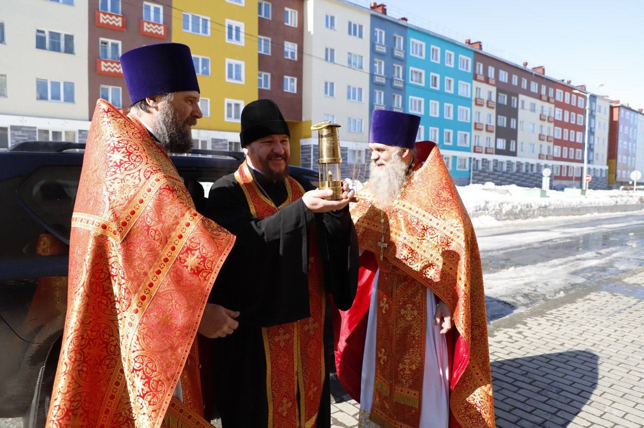 Затем Благодатный огонь был доставлен в кафедральный собор иконы Божией Матери «Всех скорбящих Радость» г. Норильска.