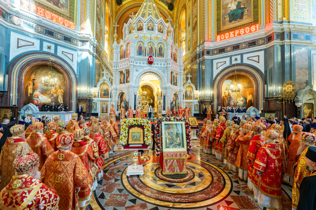 По прибытии в Храм Христа Спасителя Святейший Патриарх Кирилл поклонился чудотворной Тихвинской иконе Божией Матери, установленной в центре храма. Чудотворный образ 21 мая по благословению Его Святейшества был принесен в Москву из Тихвинского Богородичного Успенского мужского монастыря.