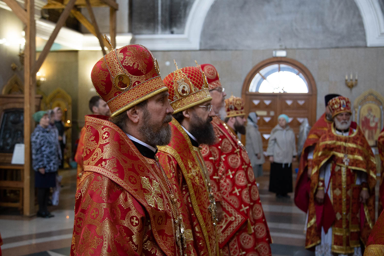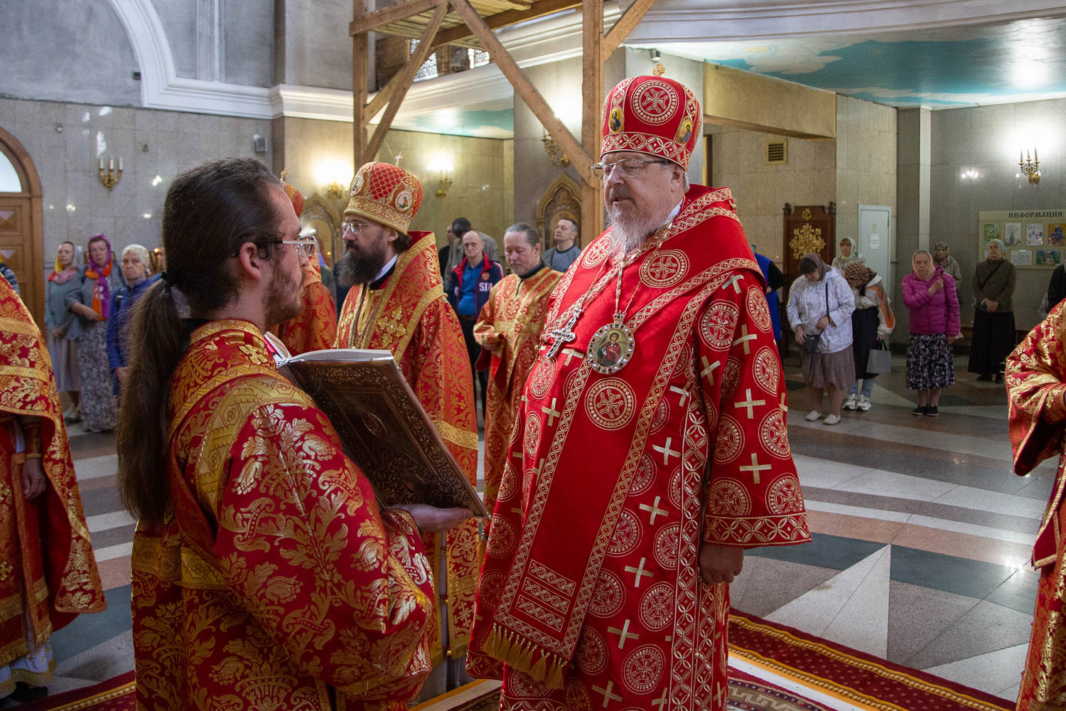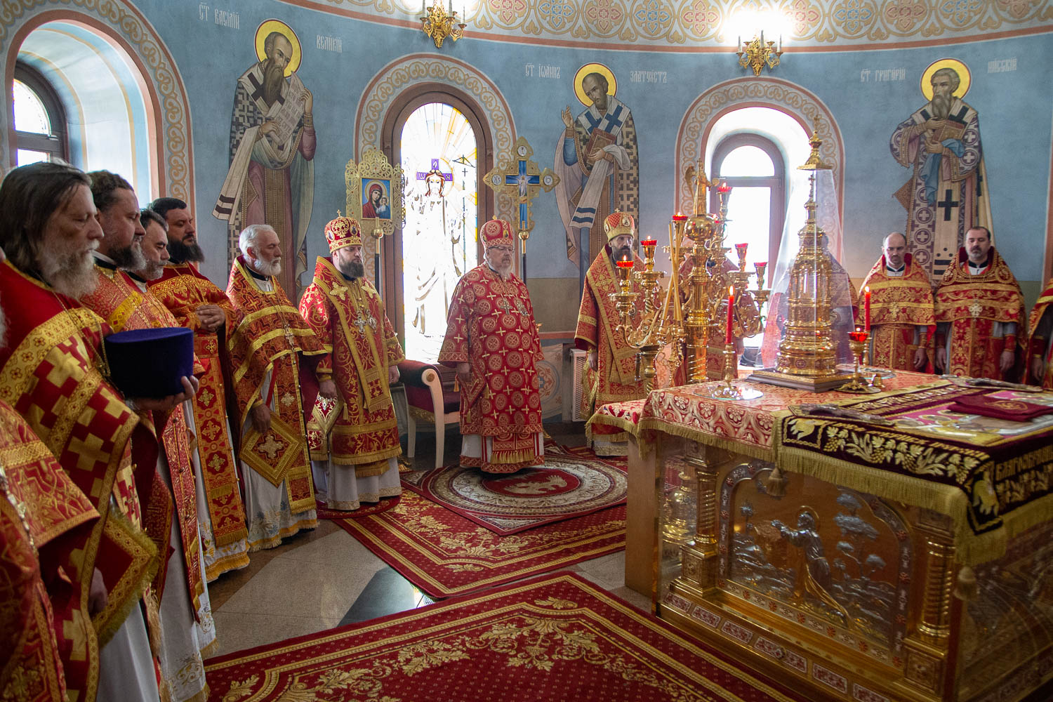 За Литургией архиереям сослужили: секретарь Красноярской епархии, благочинный церквей Левобережного городского округа Красноярска, наместник красноярского Успенского мужского монастыря игумен Иннокентий (Нилов); заведующий канцелярией Красноярской епархии, настоятель Иоанно-Предтеченского храма Красноярска протоиерей Николай Ши-кэ-мин; благочинный церквей Правобережного округа Красноярска, настоятель храма Рождества Христова Красноярска протоиерей Максим Смоляков; председатель Миссионерского отдела Красноярской епархии, благочинный Красноярского окружного благочиния, настоятель Трёхсвятительского храма Красноярска иерей Василий Вершинский; секретарь Минусинской епархии, благочинный церквей Минусинского округа, настоятель Спасского собора города Минусинска протоиерей Евгений Нещерет и штатные священнослужители Красноярской епархии.