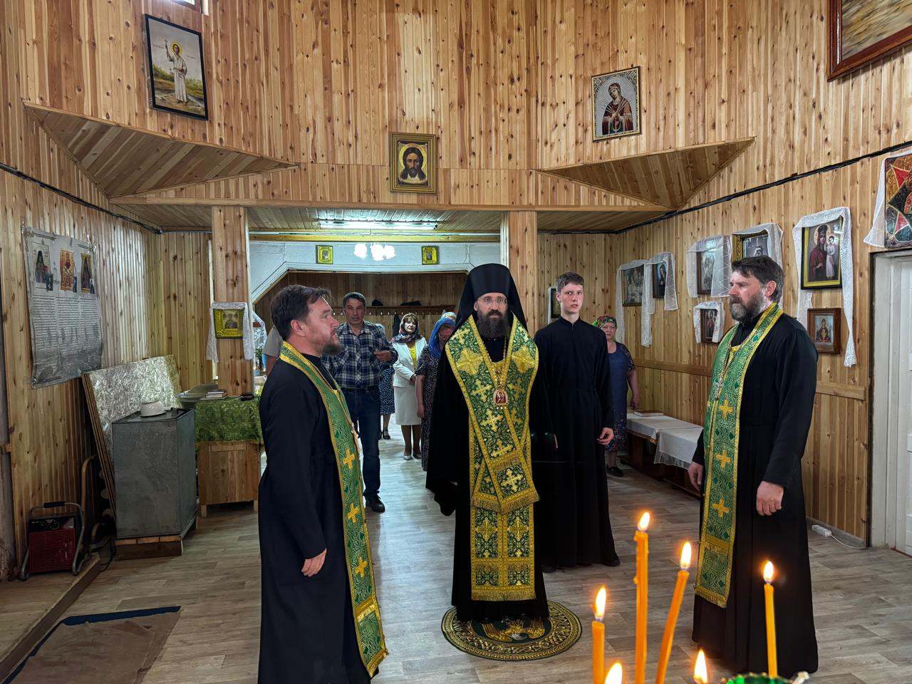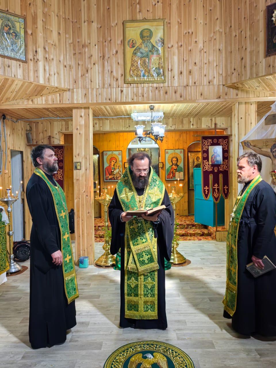 Его Преосвященству сослужили благочинный Туруханского округа, настоятель Свято-Троицкого монастыря села Туруханска игумен Софроний (Семенов) и благочинный Норильского округа иерей Геннадий Дубинко.