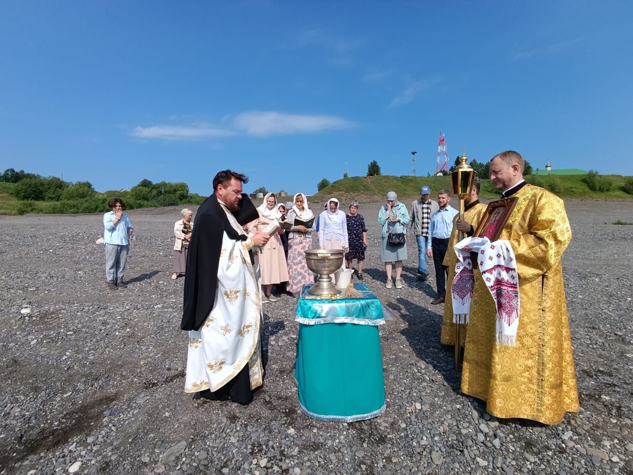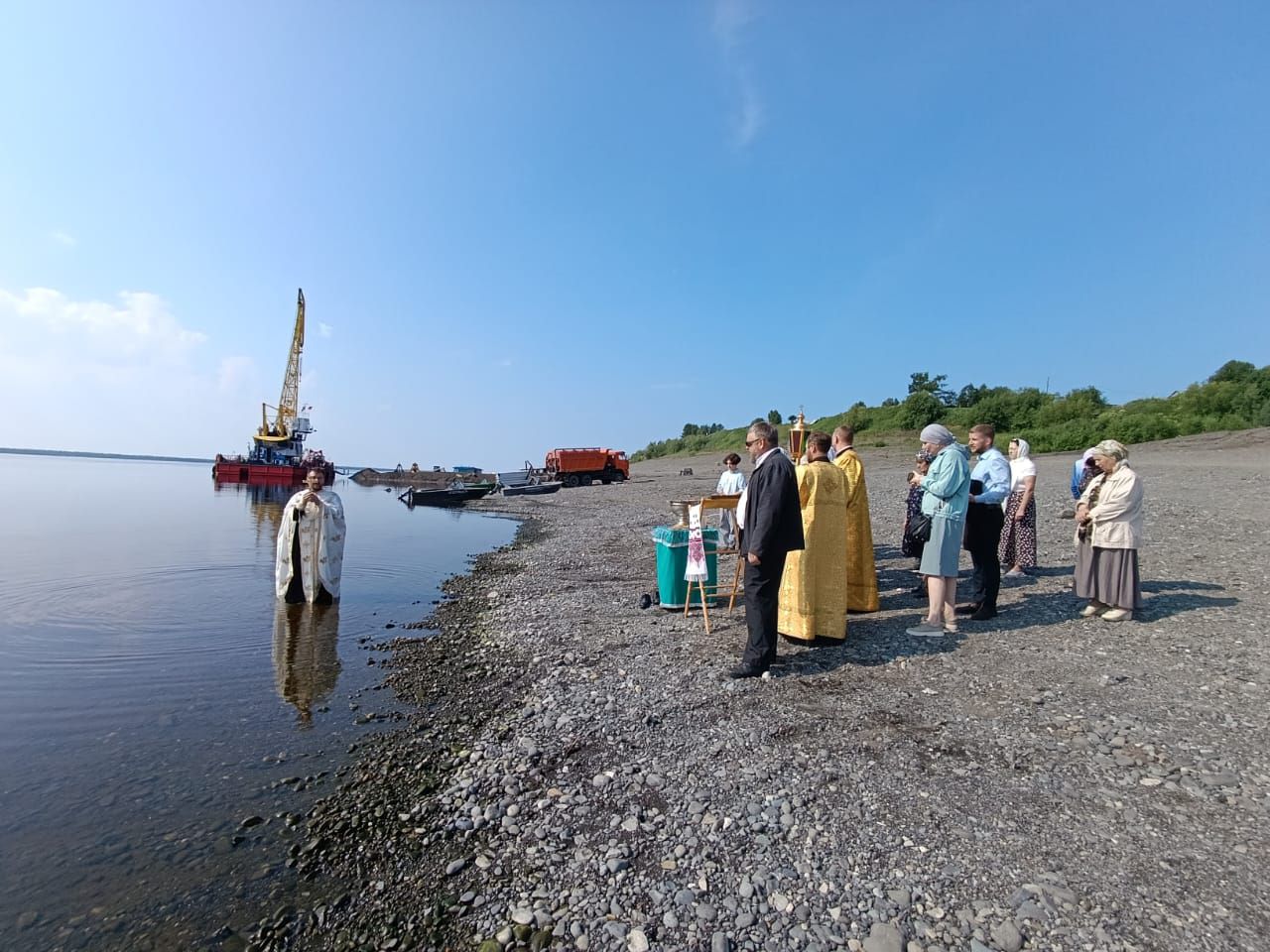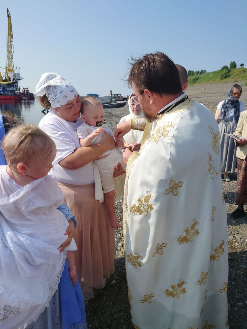 Затем состоялся крестный ход от Свято-Троицкого монастыря к берегу реки Нижняя Тунгуска, протекающей у села Туруханска, где состоялось освящение воды и было совершено Таинство Святого Крещения в водах реки над младенцами, проживающими в селе.