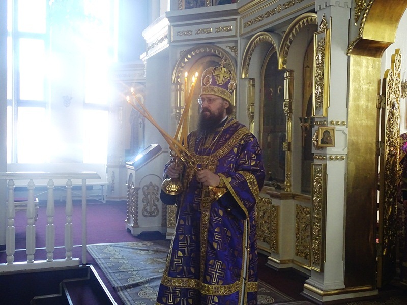 На малом входе епископ Агафангел наградил иерея Георгия Михайлова, штатного священника Норильского кафедрального собора, правом ношения камилавки.