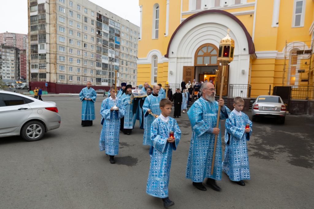 После великого славословия состоялся крестный ход вокруг храма с плащаницей с изображением Успения Пресвятой Богородицы.