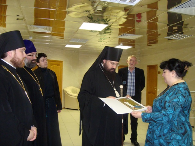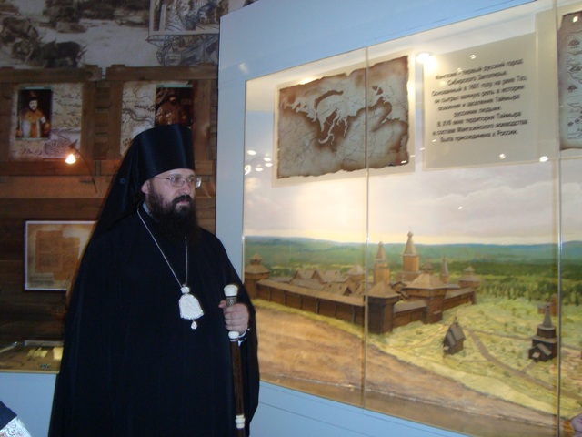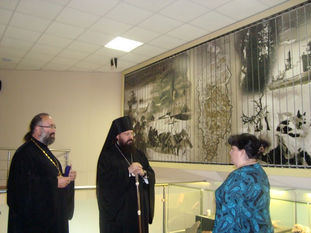 После совершения богослужении Владыка и сопровождающие его лица посетил Таймырский краеведческий музей, где его встретила заместитель директора музея Ландина Лейла Александровна и ознакомила с наиболее интересными экспонатами. Владыка Агафангел подарил музею икону святого мученика Василия Мангазейского.