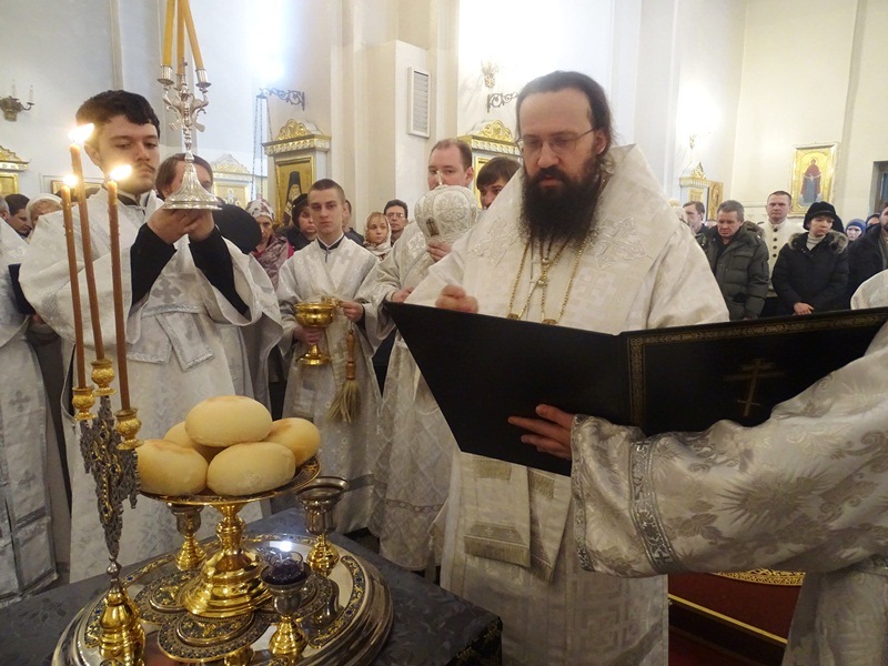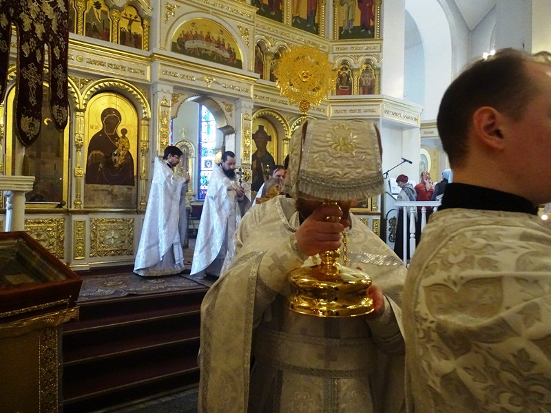 По заамвонной молитве Архипастырь совершил освящение хлеба и вина и поздравил паству с Великой субботой.