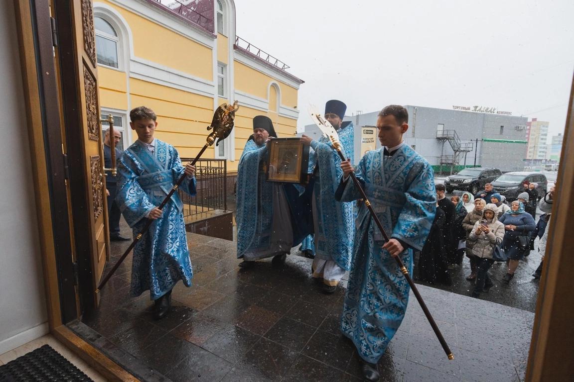 Перед началом Литургии Казанская икона Божией Матери была поставлена на центральном аналое храма.