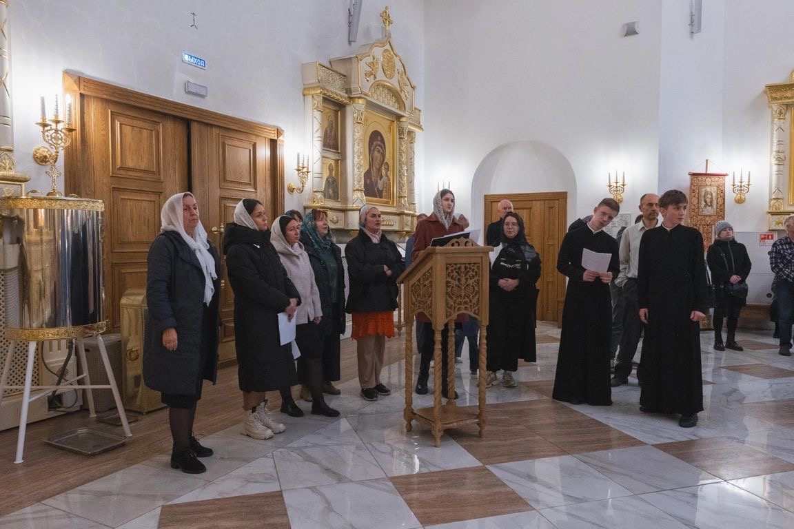 Богослужебные песнопения исполнил сводный хор кафедрального собора иконы Божией Матери «Всех скорбящих Радость» г. Норильска и храма великомученицы Варвары в р-не Талнах г. Норильска под управлением Анны Сергеевны Щелоковой.