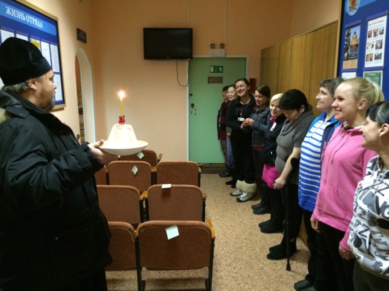 Совершив праздничные молебны в храме Святой Анастасии Узорешительницы и часовне Святого Апостола Андрея Первозванного и поздравив прихожан Пасхой Христовой, отец Димитрий преподнес в дар собравшимся пасхальные куличи и крашеные яйца, а также передал всем Архипастырское благословение Преосвященнейшего Агафангела епископа Норильского и Туруханского. Особенно трогательной получилась встреча в женском отделении колонии-поселения. Батюшка в словах проповеди, обратившись к женщинам-осужденным, многие их которых будучи матерями, оказались оторванными от своих детей, призвал их уповать на милость ныне воскресшего Христа и помнить о великом милосердии Божием и огромной силе материнской молитвы.