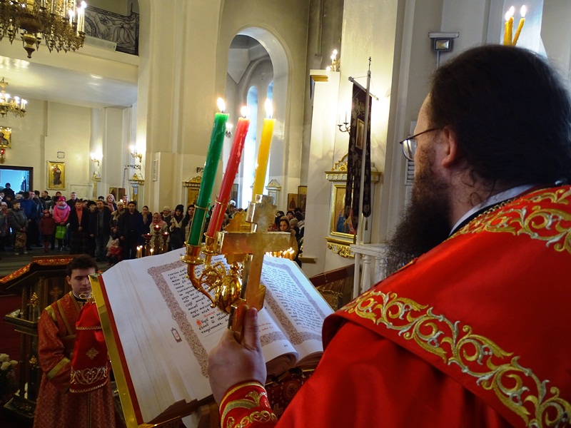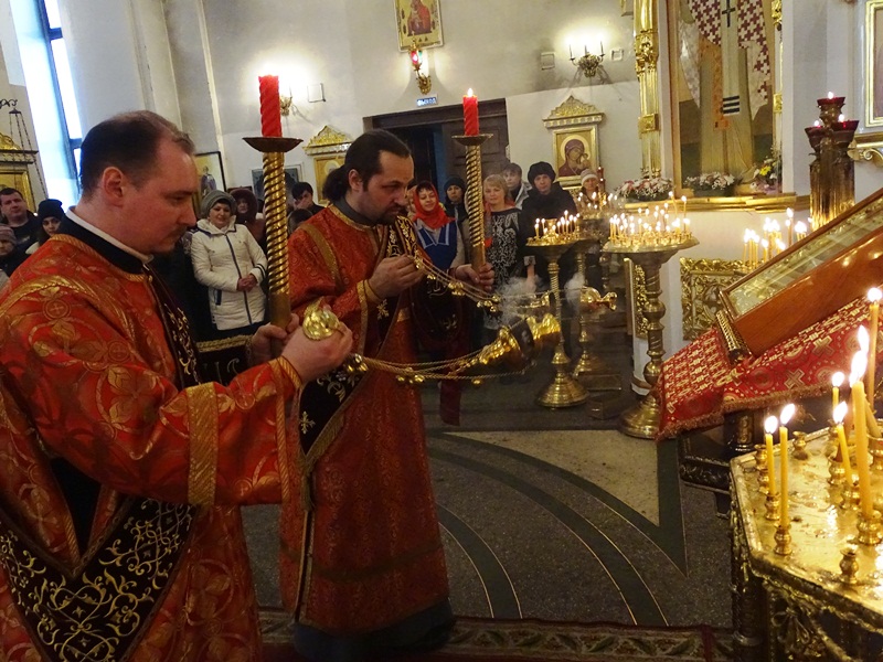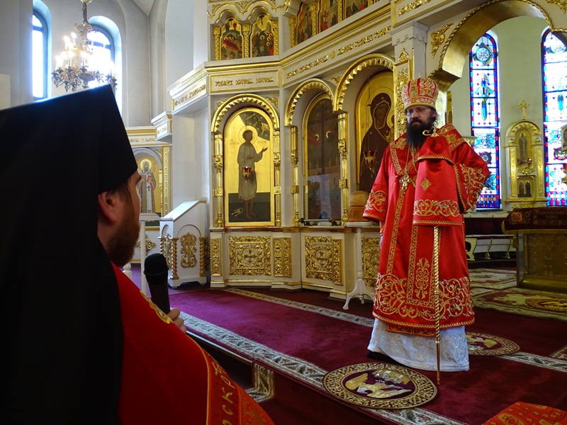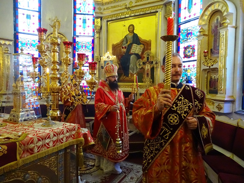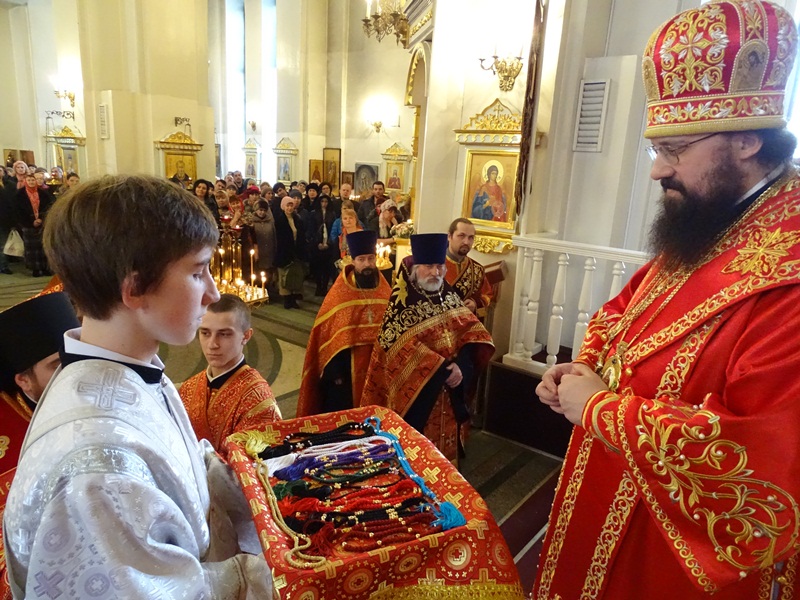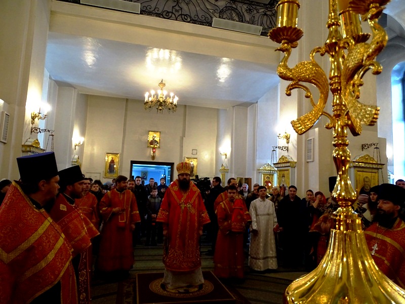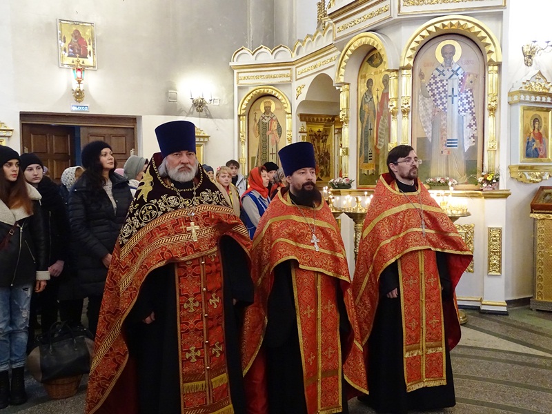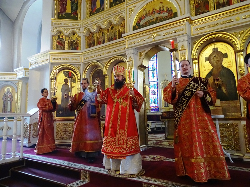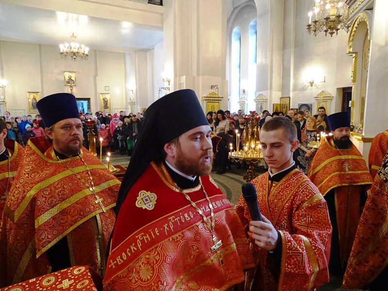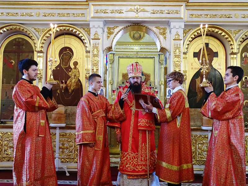 Его Преосвященству сослужили: секретарь Норильской епархии иеромонах Герман (Мельников); благочинный Норильского округа протоиерей Владимир Иванов; председатель епархиального отдела по взаимодействию с силовыми структурами протоиерей Димитрий Харцыз; председатель епархиального отдела по социальному служению и церковной благотворительности иерей Сергий Андреев; председатель епархиального молодежного отдела диакон Алексий Трофимов; штатное духовенство собора.