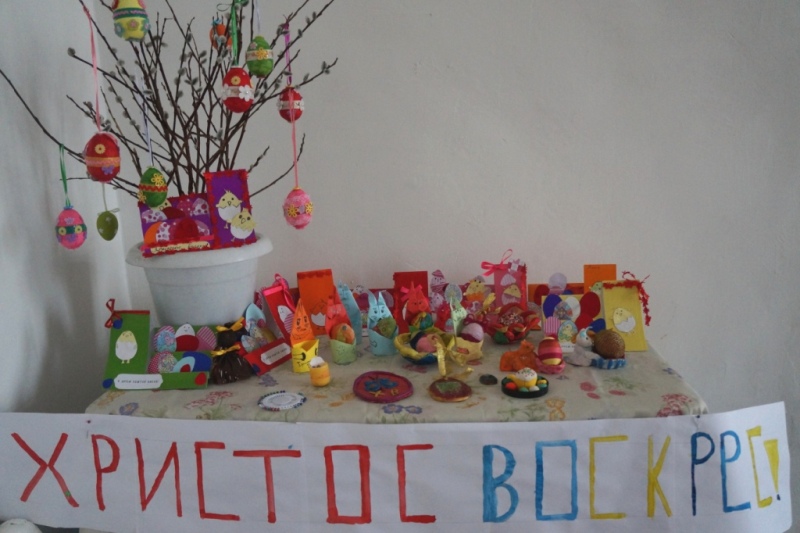 Готовились к выставке заранее, на воскресных занятиях мастерили открытки, собирали подставки для яиц в технике оригами, изготавливали собственные оригинальные поделки дома. А прихожанка храма, педагог дополнительного образования Елена Геннадьевна Чалкина провела для ребят мастер – класс по декорированию пасхальных яиц. Как всегда под её руководством работа ладилась, и получившиеся яйца в композиции с веточками вербы стали украшением выставки.