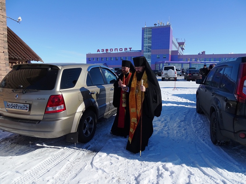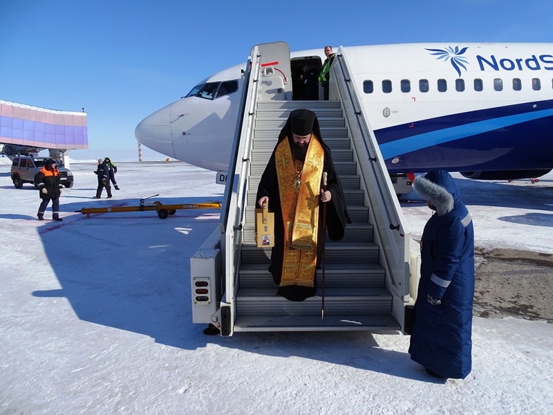 Возле трапа самолета, на посадочной полосе норильского аэропорта «Алыкель», Преосвященнейшего епископа Агафангела, который привез Благодатный огонь на норильскую землю, встречали секретарь Норильской епархии иеромонах Герман (Мельников), благочинный Таймырского округа протоиерей Георгий Ицков и генеральный директор аэропорта «Алыкель» Никифоров Андрей Владимирович. Его Преосвященство сопровождал настоятель Свято-Троицкого Туруханского монастыря игумен Софронии (Семенов).