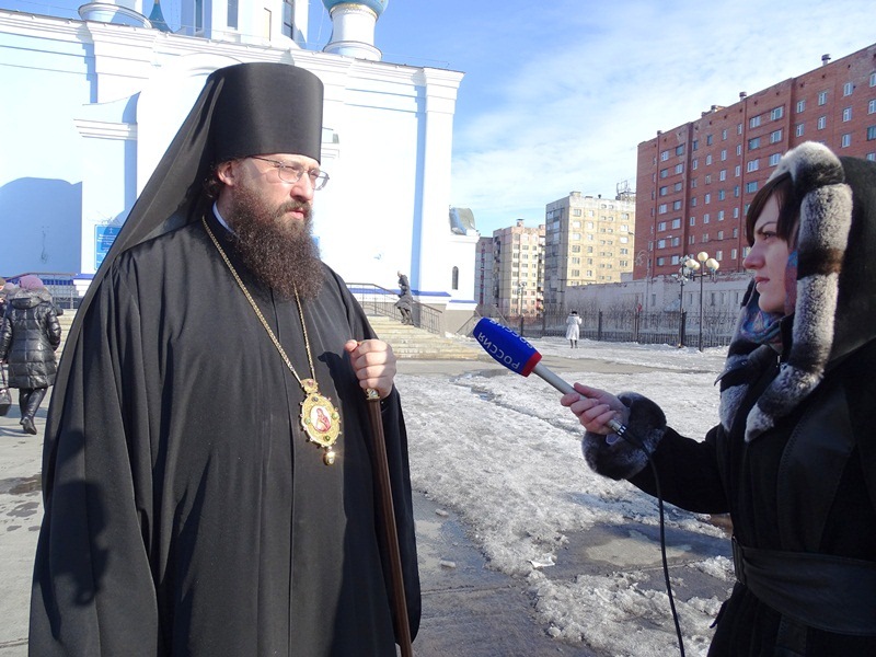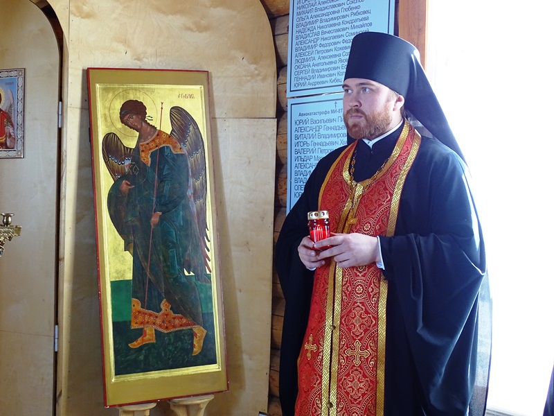 По прибытии рейса Архипастырь, в сопровождении духовенства, направился в храм Архангела Михаила, расположенный на территории аэропорта. В святом храме Архиерея и святыню встречал настоятель Архангело-Гаврииловского храма района Кайеркан протоиерей Сергии Пивоваров. Духовенство пропели тропарь Воскресения Христова и Епископ возжег светильники храма от Благодатного огня.