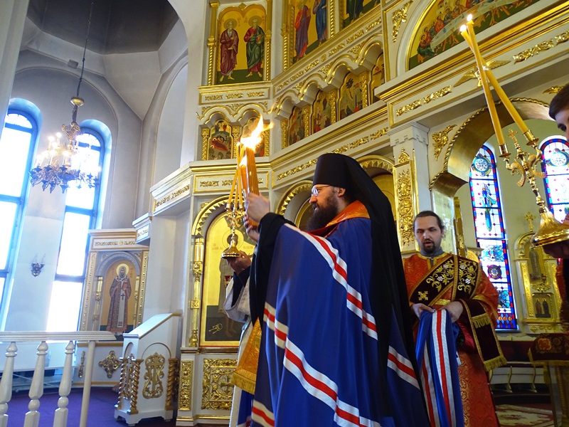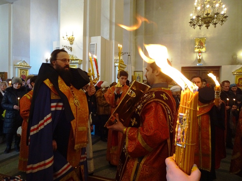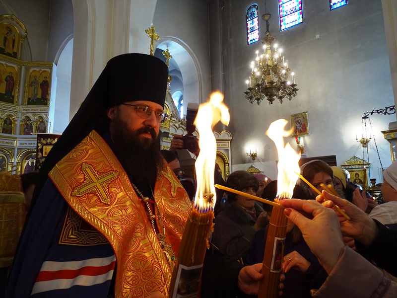 По красной ковровой дорожке Владыка Агафангел под колокольный звон прошел через церковный двор, храм и прошел в алтарь. Через несколько минут все лампады в алтаре были зажжены от Благодатного Огня и Владыка вышел на солею к прихожанам с двумя пучками подожженных от него иерусалимских свечей. А затем огонь разошелся по храму, его многочисленных лампад. Зажглись свечи прихожан, цветные фонарики, купленные в церковной лавке и сделанные своими руками.