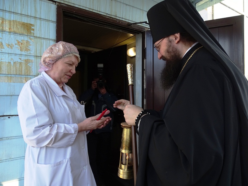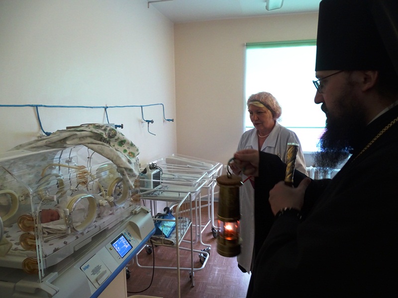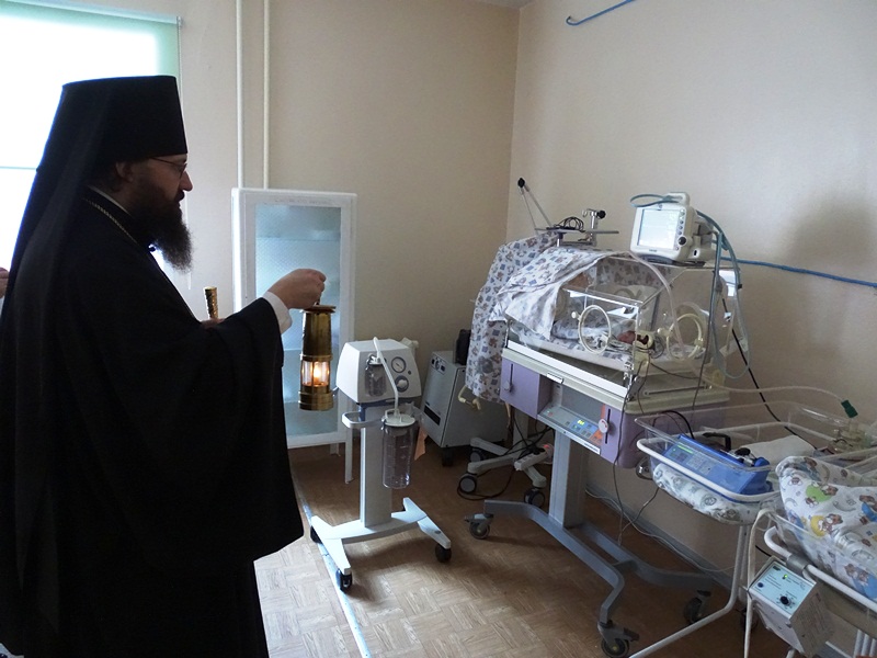 Архипастырь Норильской Земли, в сопровождении председателя епархиального отдела социального служения иерея Сергия Андреева, направился с иерусалимской святыней в норильский родильный дом. Там гостей встречала главный врач Ласточкина Татьяна Владимировна, которая сопроводила делегацию в часовню святой равноапостольной княгини Ольги, где после краткого молебна святой огонь был пронесен по всем помещениям медицинского учреждения.