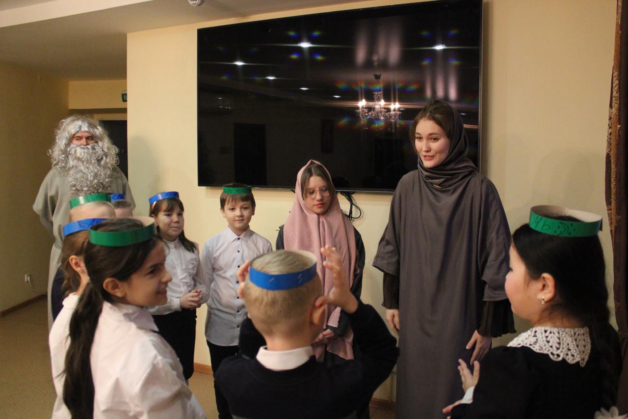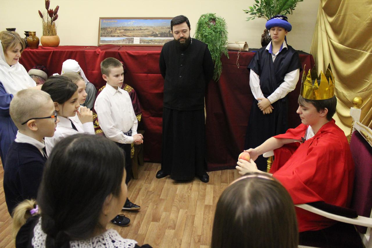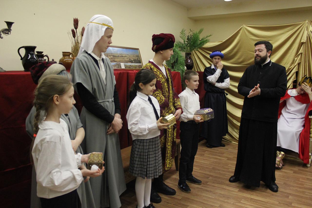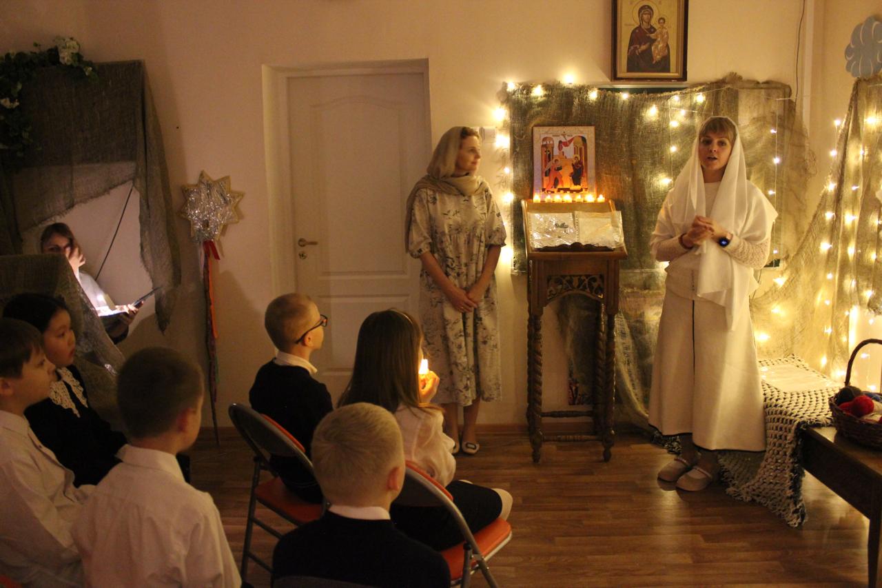 Педагоги воскресных школ и воспитанники подросткового клуба воскресной школы кафедрального собора города Норильска познакомили участников мероприятия с историей Иоакима и Анны – родителей Пресвятой Богородицы, рассказали о детстве и посвящении Богу Божией Матери, о праведном Иосифе Обручнике, о Рождестве Иисуса Христа, поклонении пастухов и волхвов, а также об истории Иудейского царя Ирода.