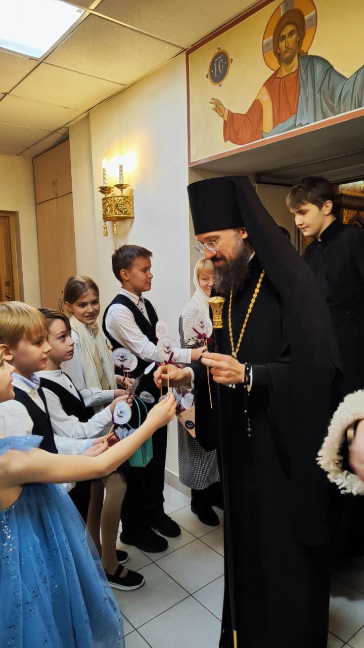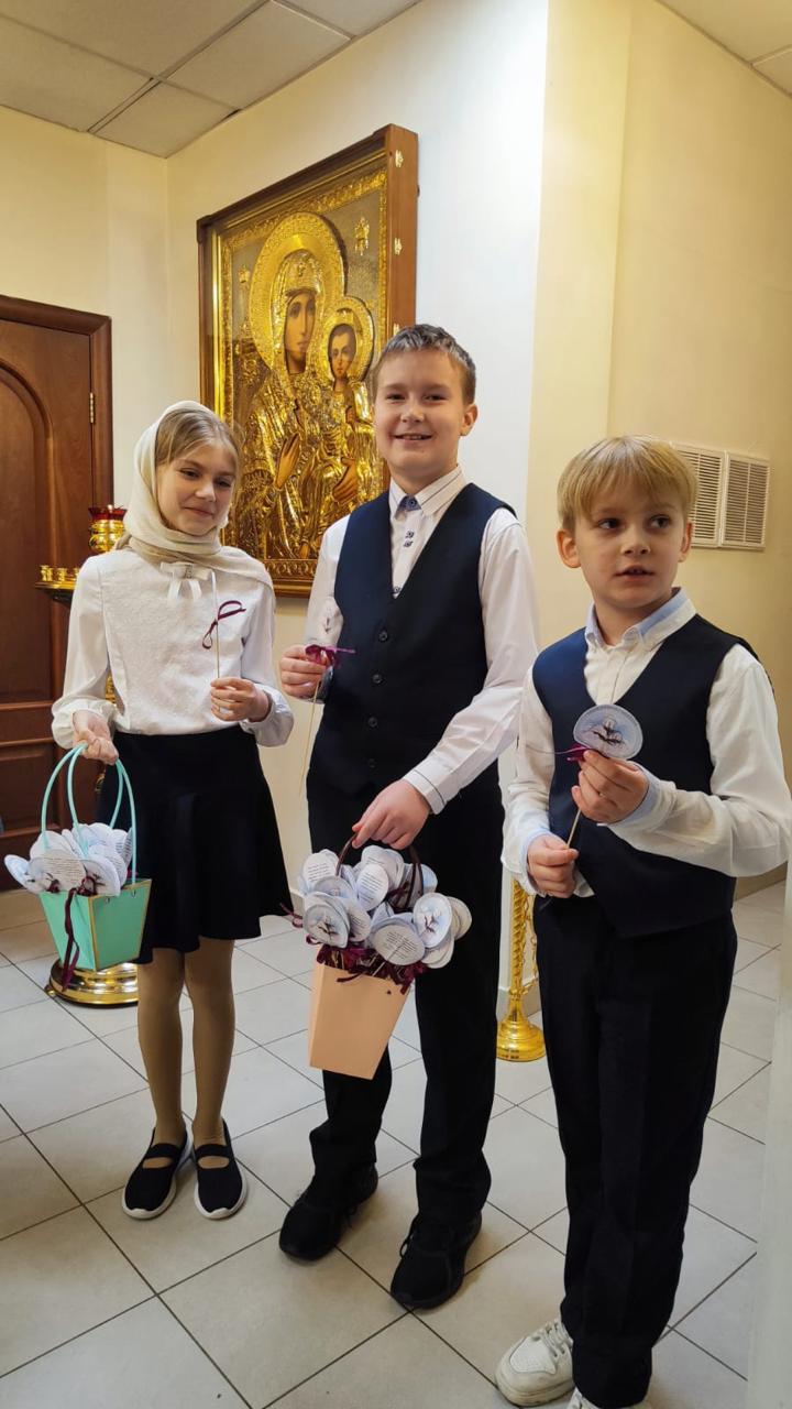 Перед началом мероприятий воспитанники воскресной школы, действующей при храме, вручили участникам богослужения памятные подарки, изготовленные своими руками.