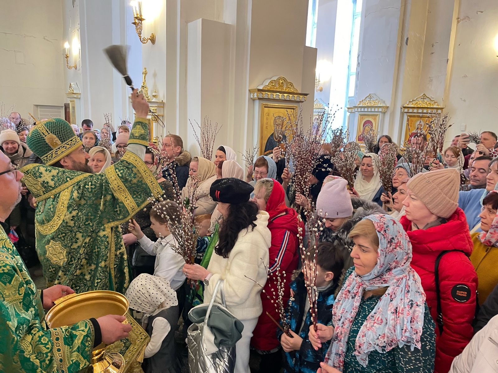 Накануне, вечером 12 апреля, епископ Агафангел в сослужении духовенства совершил всенощное бдение и освящение вербных ветвей.