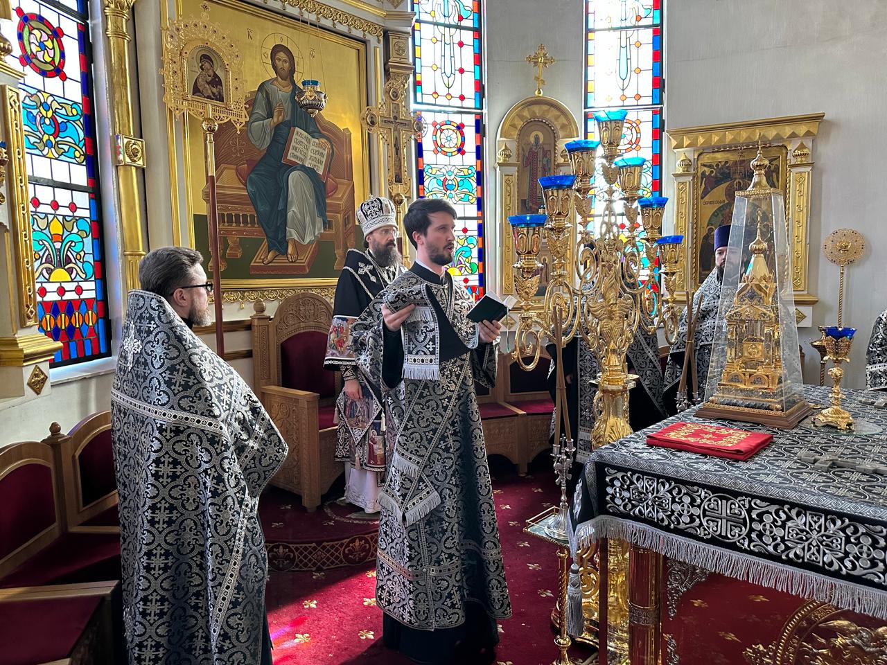 Затем был прочитан канон «О распятии Господа и на плач Пресвятой Богородицы». Епископ Агафангел поклонился Плащанице Спасителя.