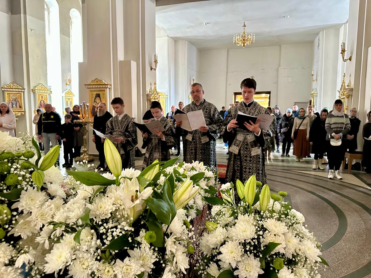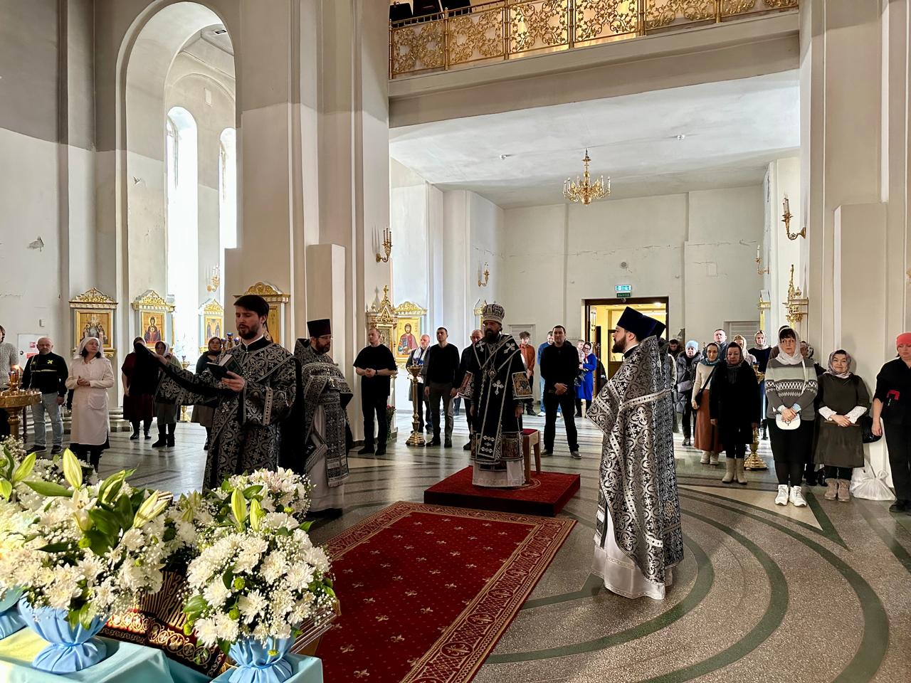 На сугубой ектении были вознесены особые прошения. Затем Архипастырь прочитал молитву о мире на Святой Земле. Ежегодно эта молитва возносится во всех храмах Русской Православной Церкви на Литургии в Великую Субботу.