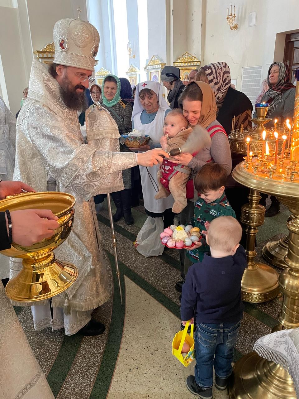 По традиции в завершение богослужения были освящены пасхальные куличи и яйца.