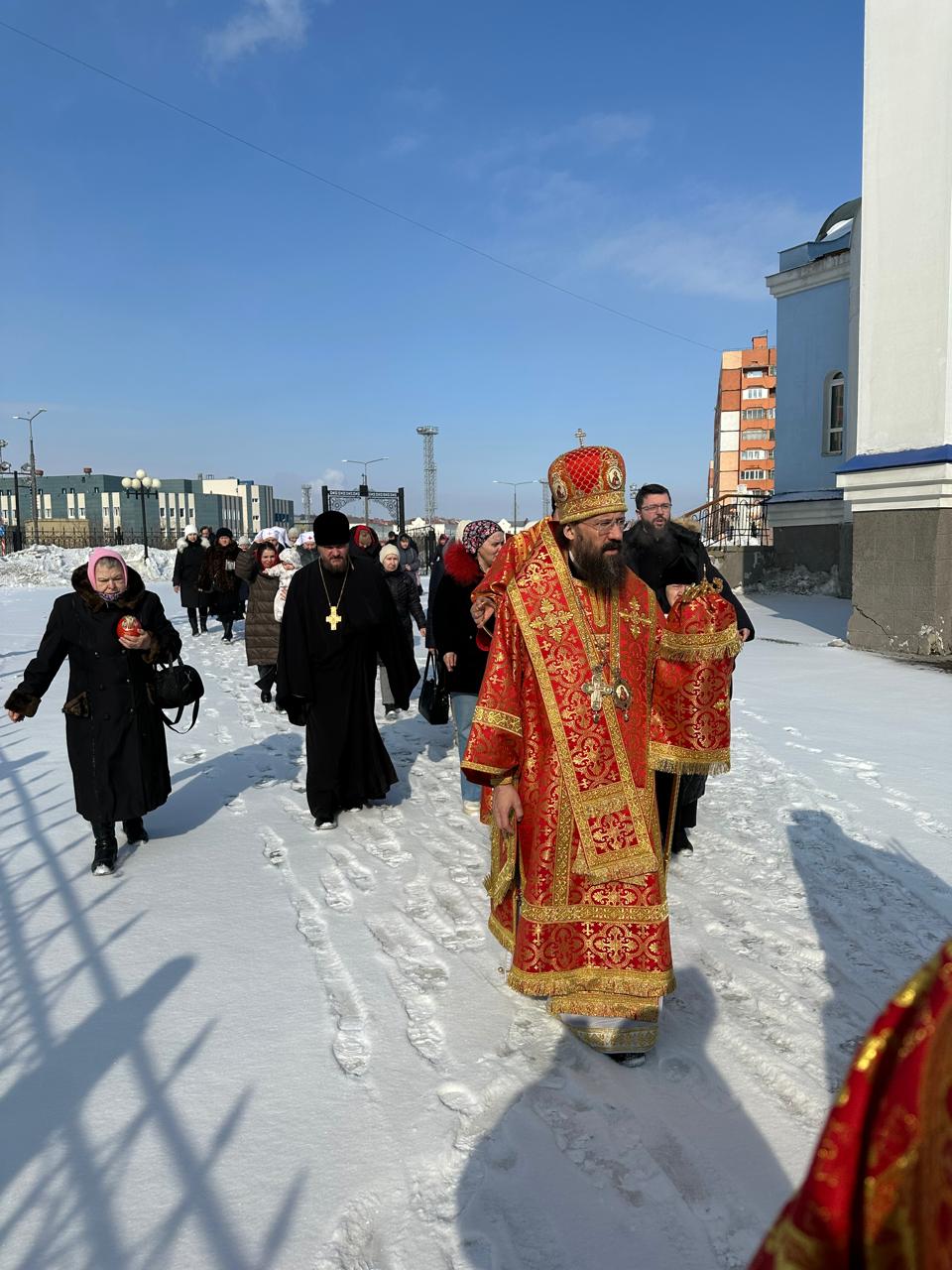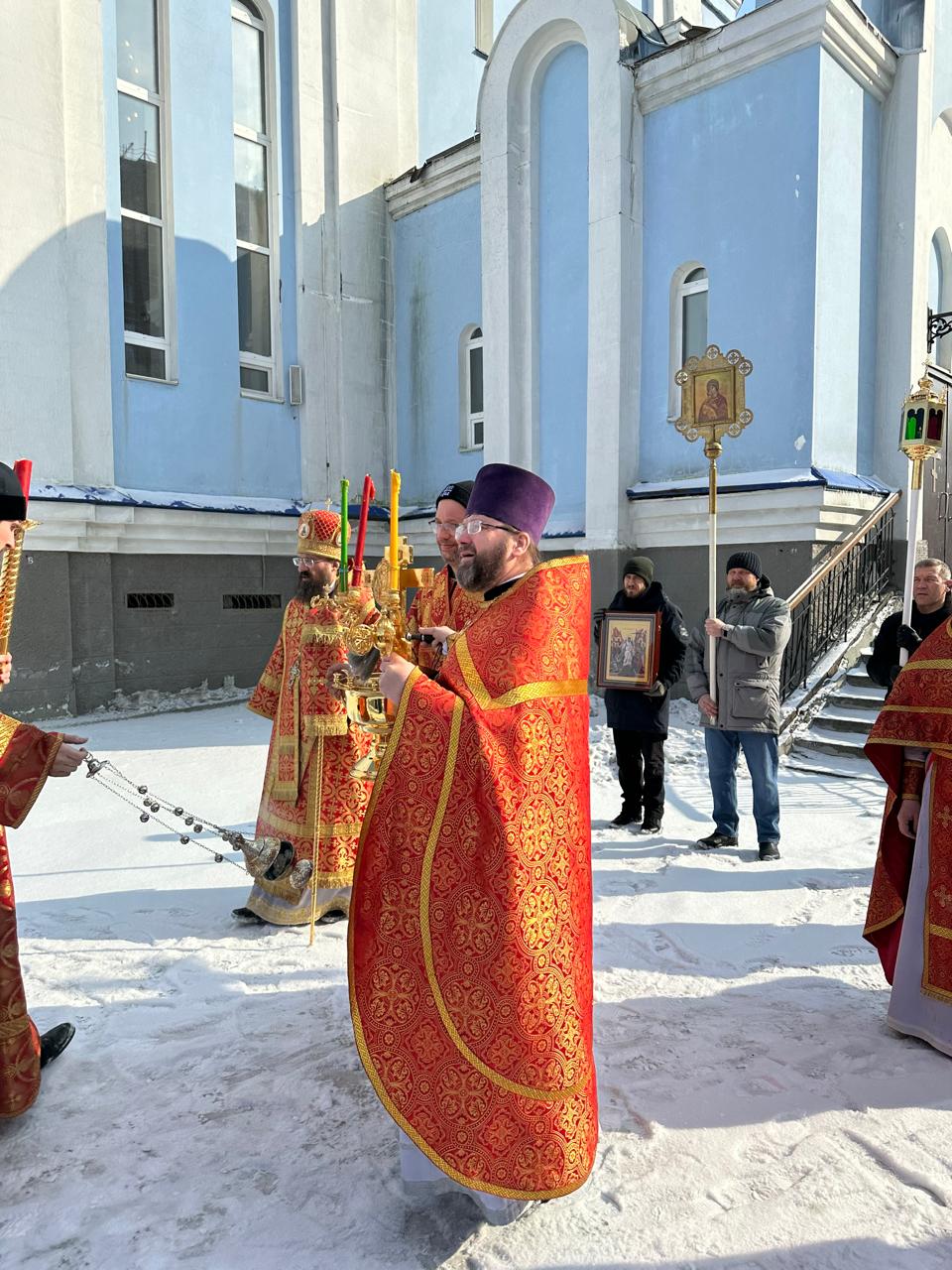 Его Преосвященству сослужили: секретарь Норильского епархиального управления, настоятель кафедрального собора иконы Божией Матери «Всех скорбящих Радость» г. Норильска иеромонах Герман (Мельников); руководитель епархиального отдела по социальному служению и церковной благотворительности иерей Алексий Пирогов; настоятель храма Сретения Господня в пос. Снежногорск Норильского промышленного района иерей Александр Макаров; помощник руководителя епархиального отдела по социальному служению и церковной благотворительности иерей Никита Челядинов; духовенство города Норильска.