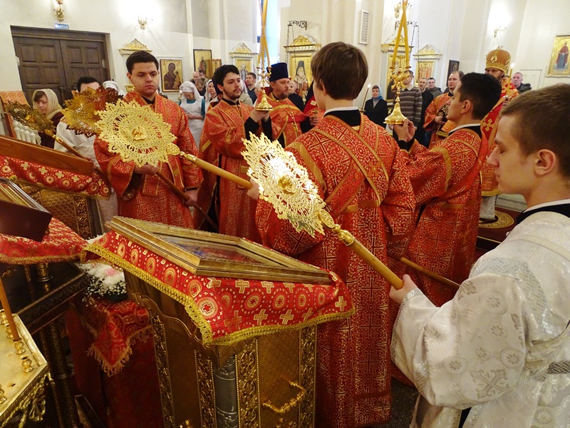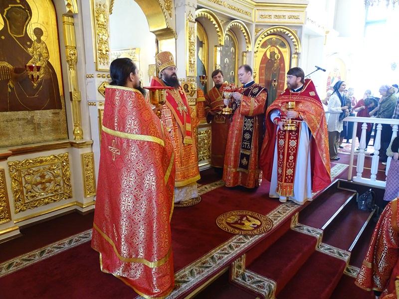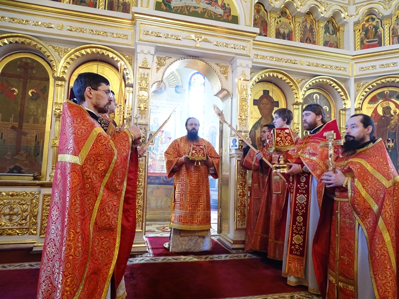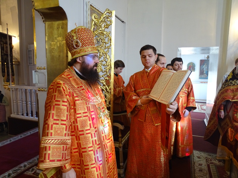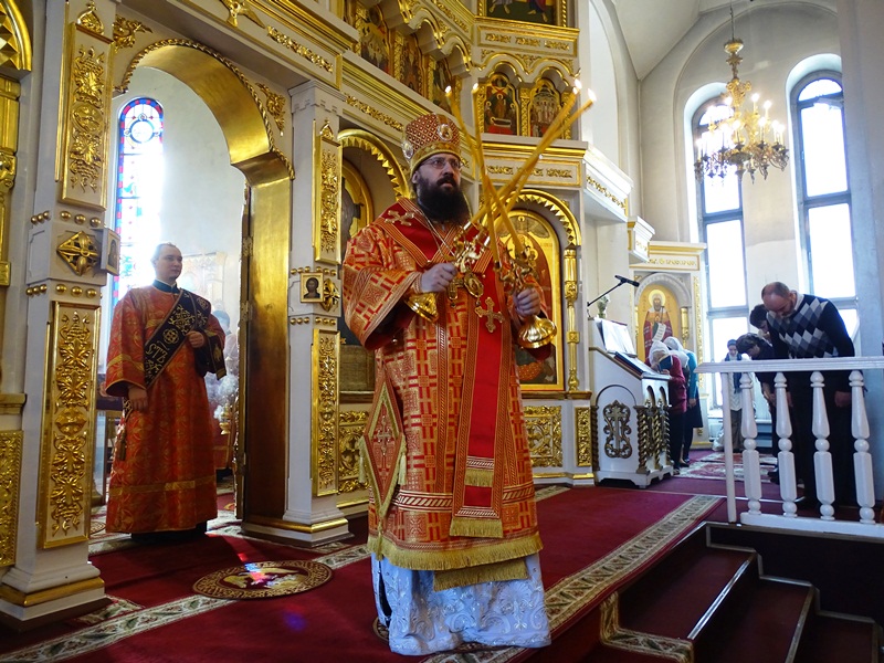 26 апреля 2015 года, Неделя 3-я по Пасхе, святых жен-мироносиц. Божественную литургию в кафедральном соборе города Норильска возглавил епископ Норильский и Туруханский Агафангел.