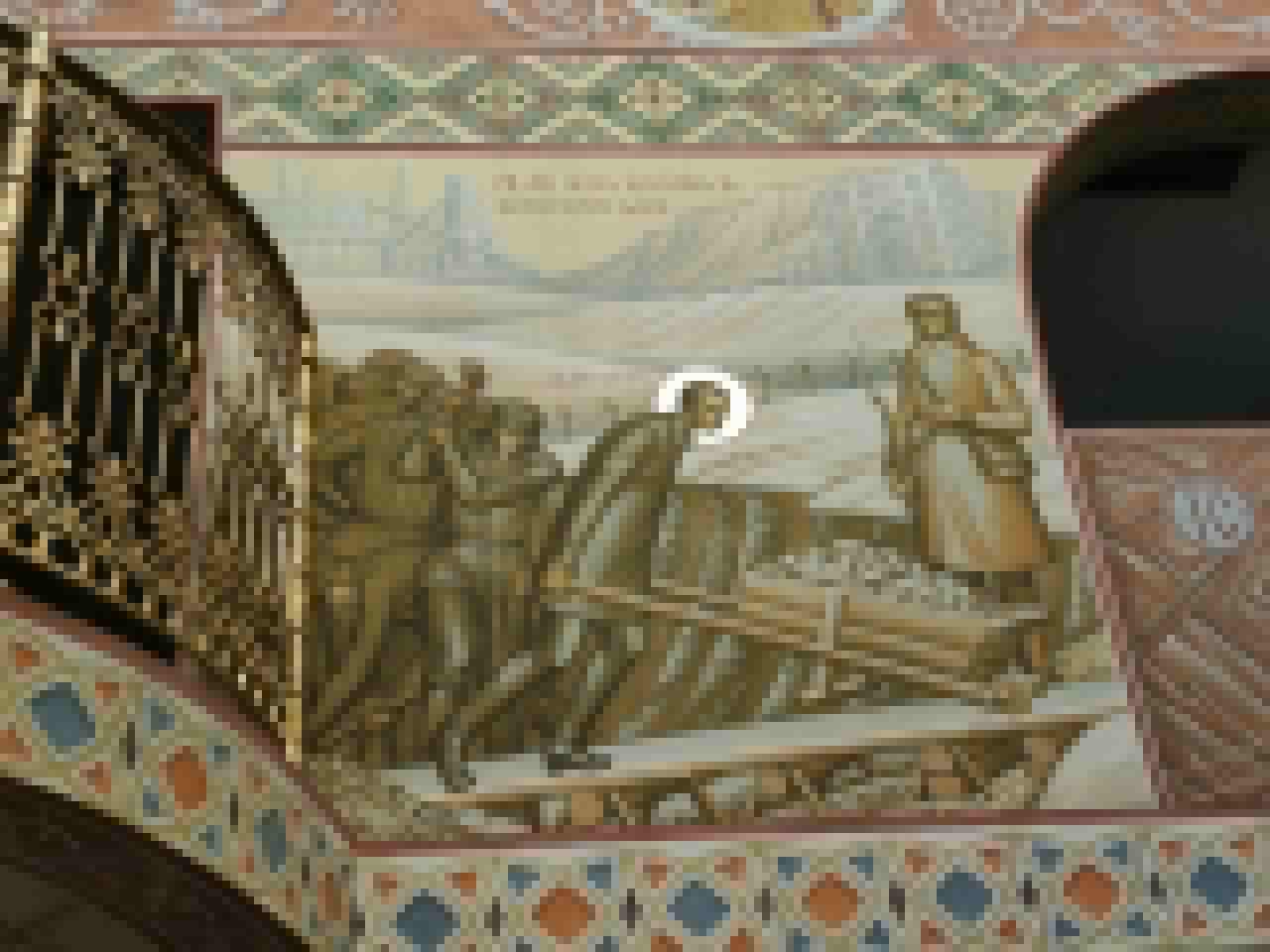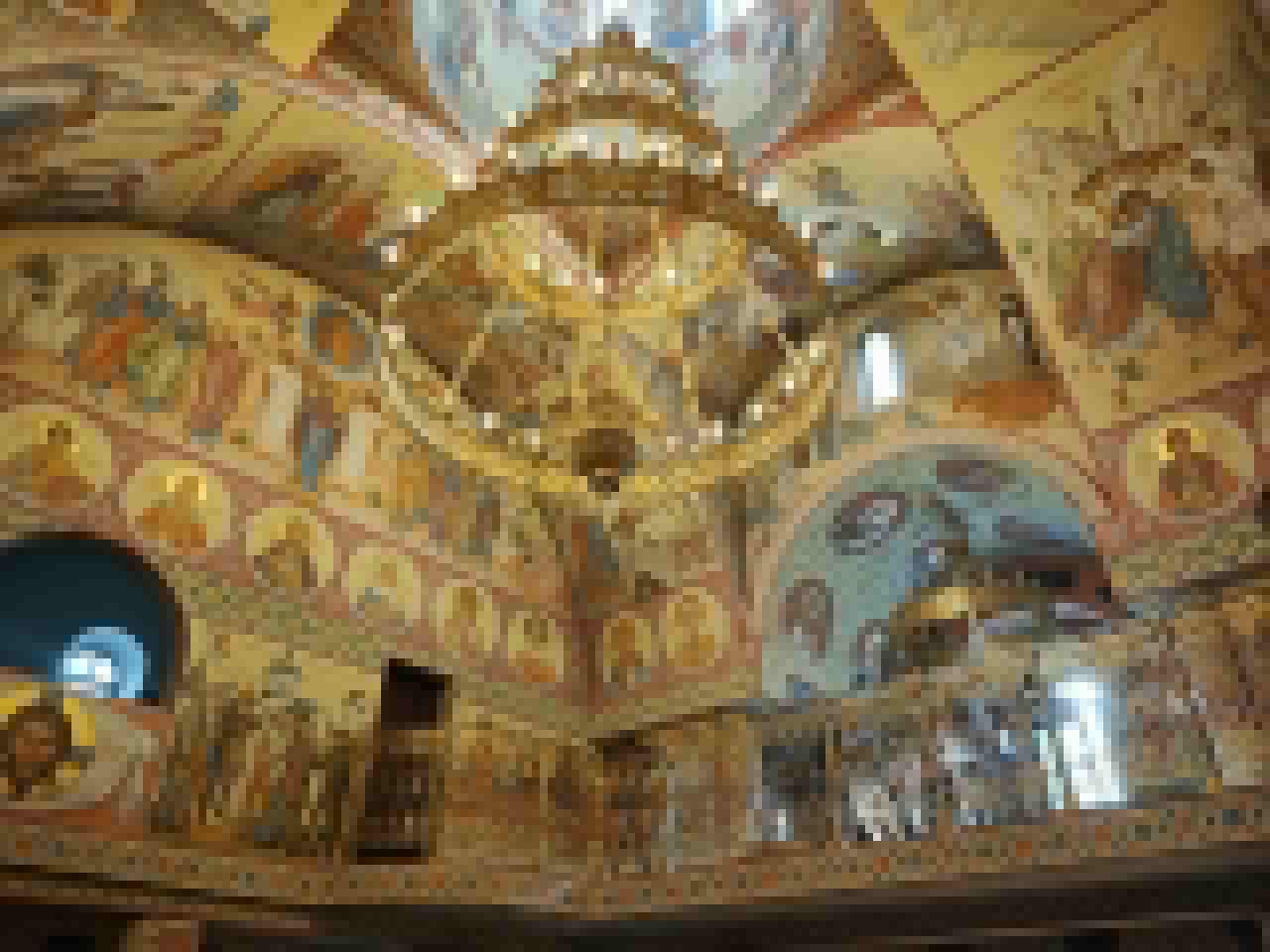 Епископ Агафангел показал митрополитам и сопровождающим их лицам настенные росписи храма, связанные с эпизодами жизни новомучеников и исповедников Церкви Русской на территории Норильской епархии.