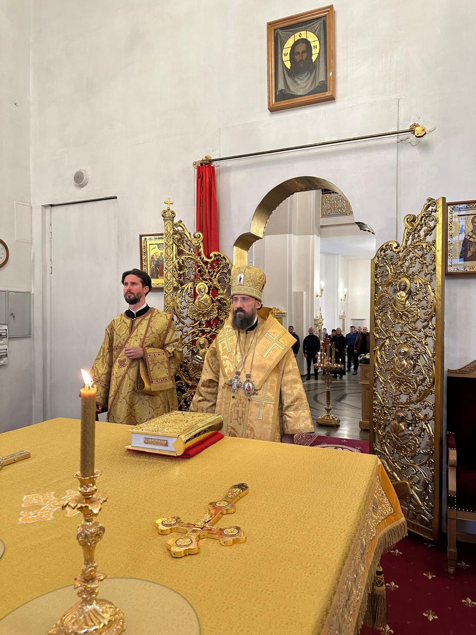 За Литургией 13 сентября Его Преосвященству сослужили: секретарь Норильской епархии, настоятель кафедрального собора иконы Божией Матери «Всех скорбящих Радость» г. Норильска иеромонах Герман (Мельников); cекретарь Комиссии Русской Православной Церкви по развитию паломничества и принесению святынь иерей Василий Ковальчук; руководитель отдела по делам молодёжи Норильской епархии, благочинный кафедрального собора г. Норильска иерей Димитрий Прохоров; духовенство Норильской епархии.